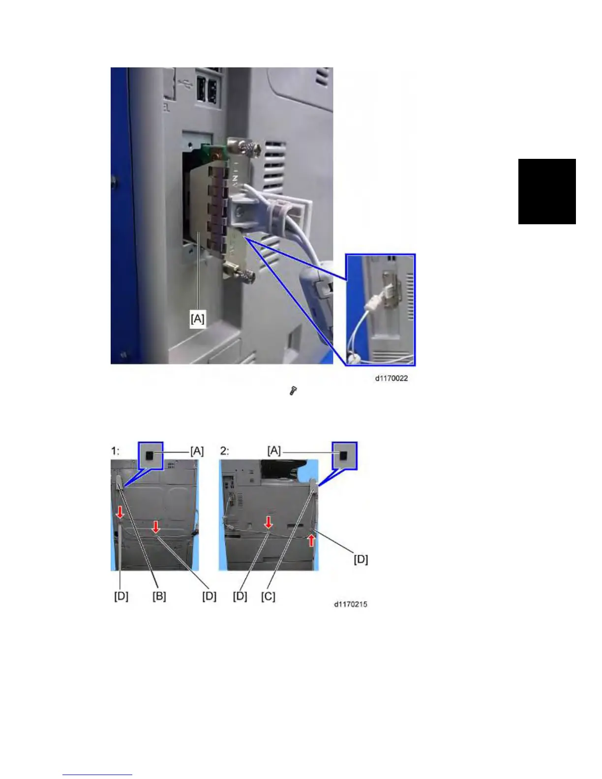 5. Attach "ANT1" (having a black ferrite core) [B] to the rear of the machine.