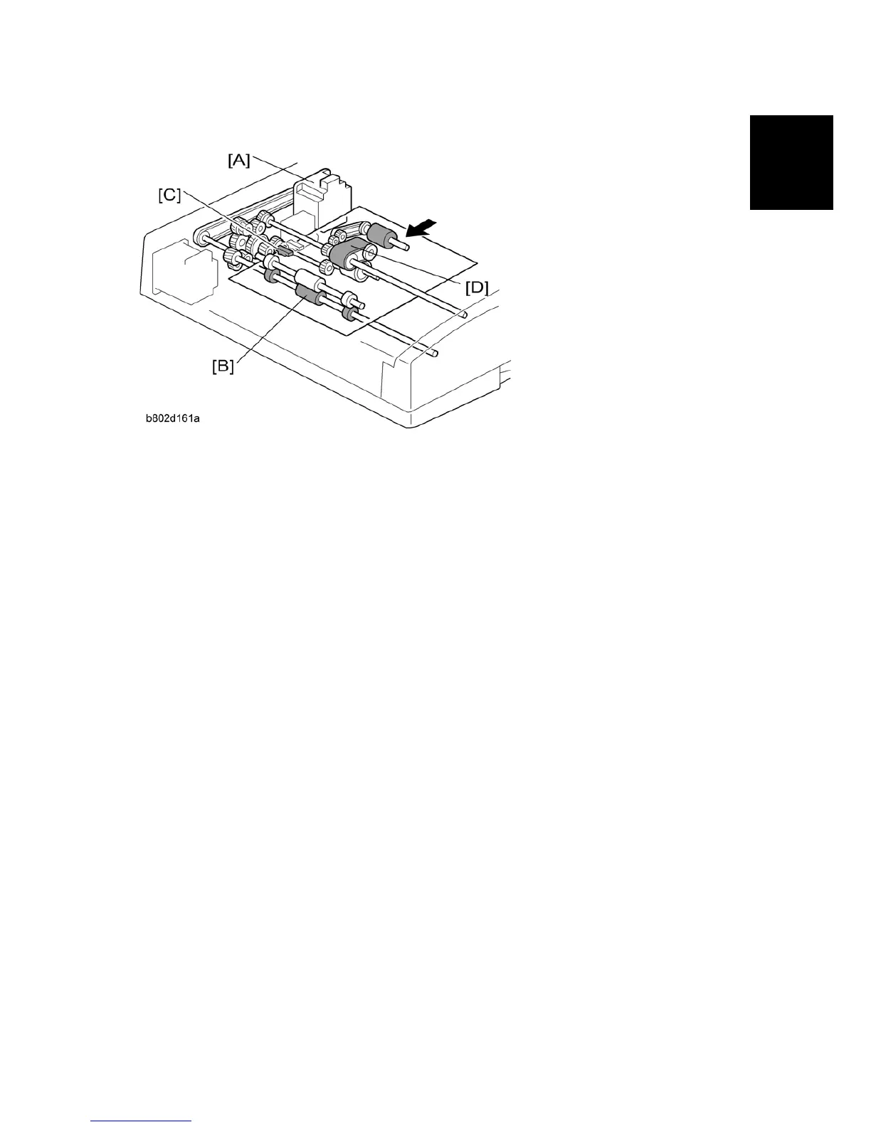 motor [A] turns off and rotates in reverse. At this time, the skew correction roller [B] and the feed