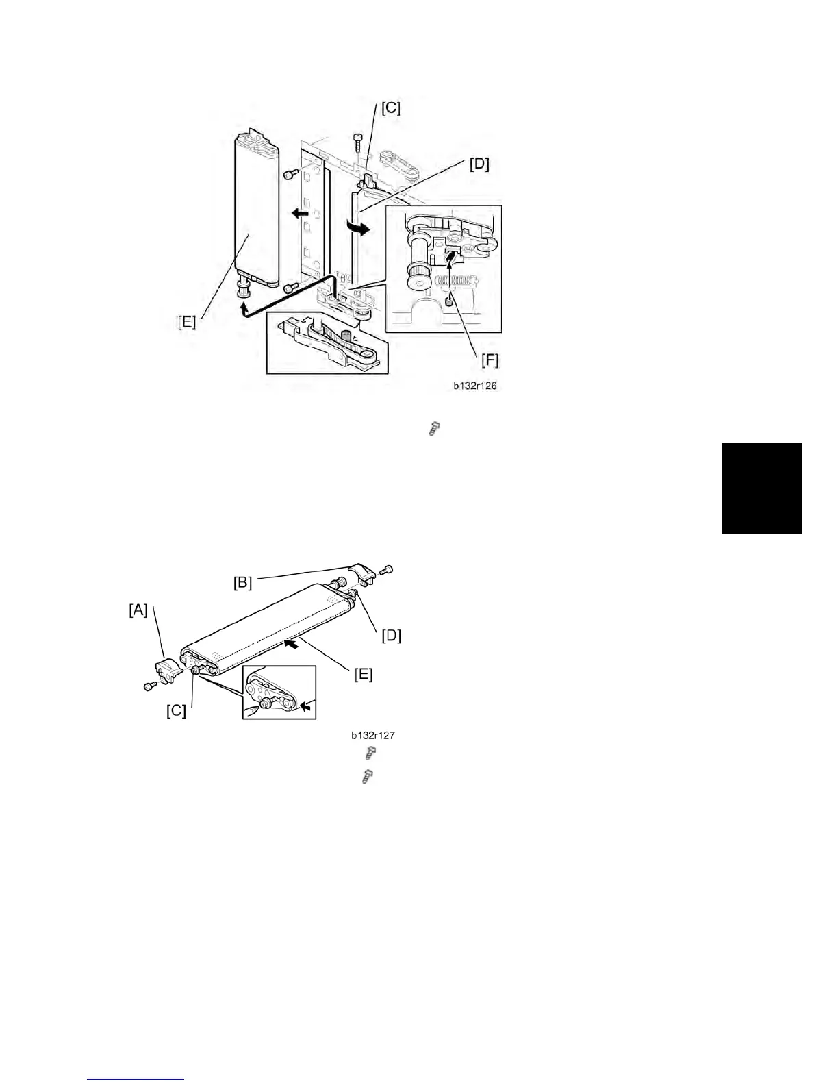 6. While squeezing the belt and rollers together in the center, tighten screws [C] and [D]. This