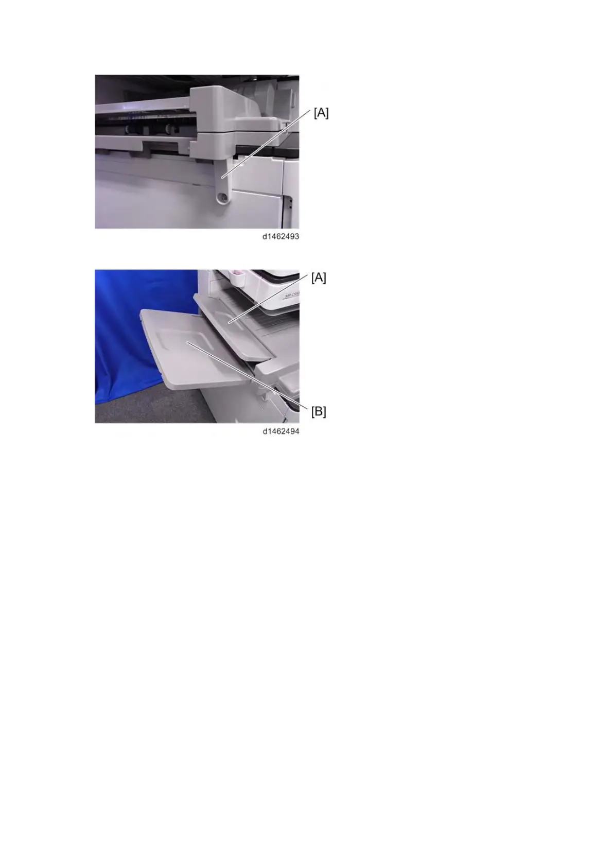 11. Attach the upper extension tray [A] and the left extension tray [B].