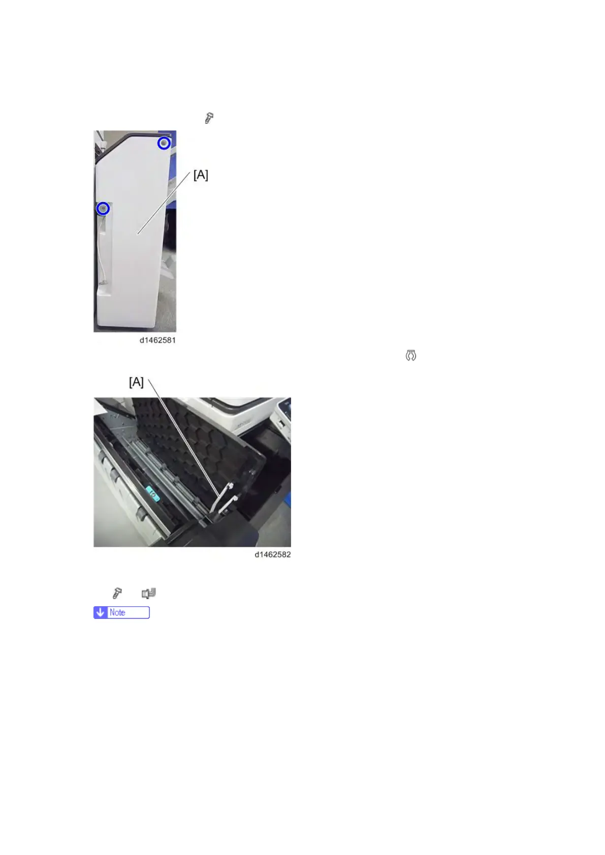 4. Remove the arm [A] of the guide plate from the finisher top cover ( ×1).