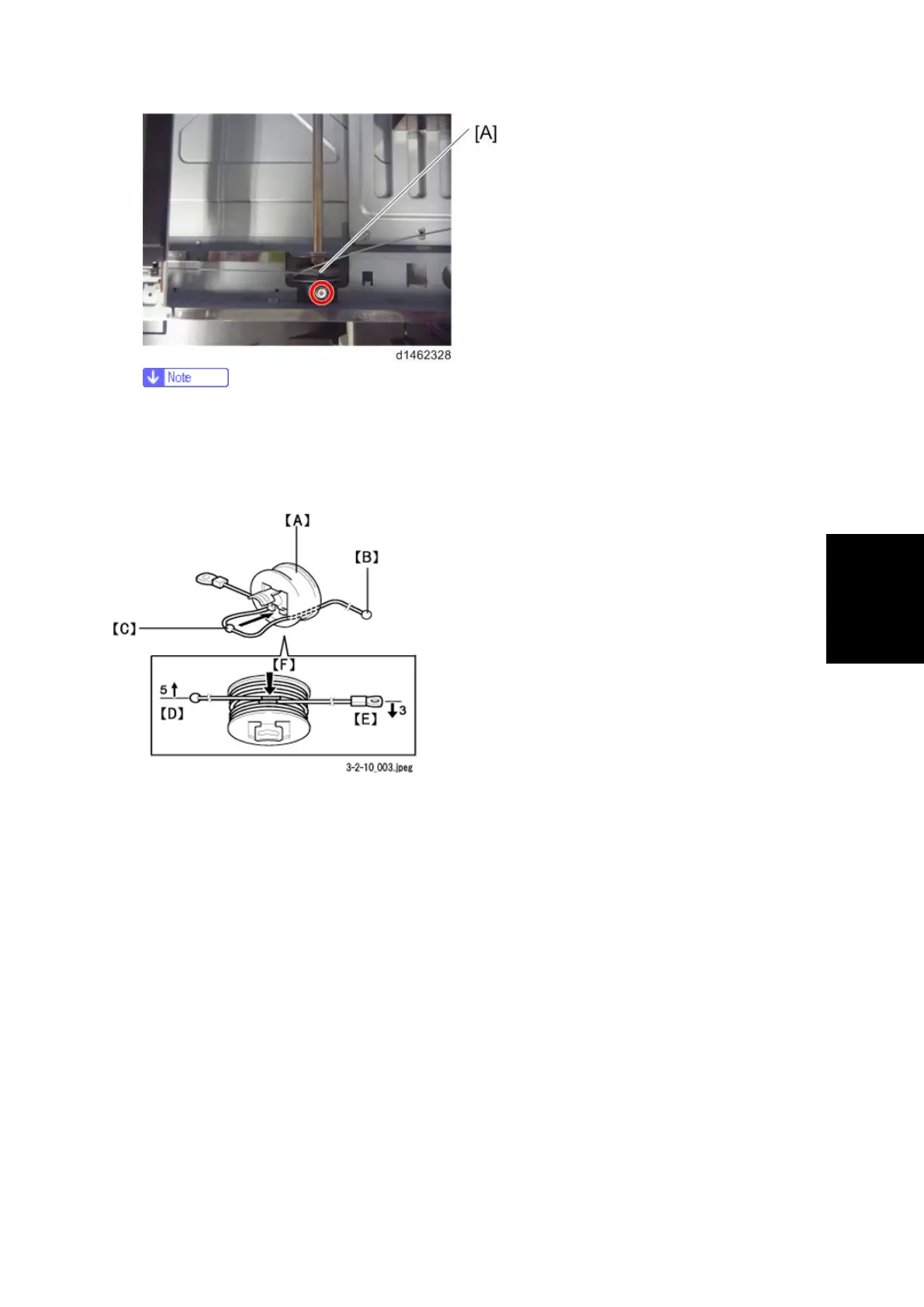 1. Pull the scanner wire ball end [B] to the pulley [A] from the left side of the pulley as shown in