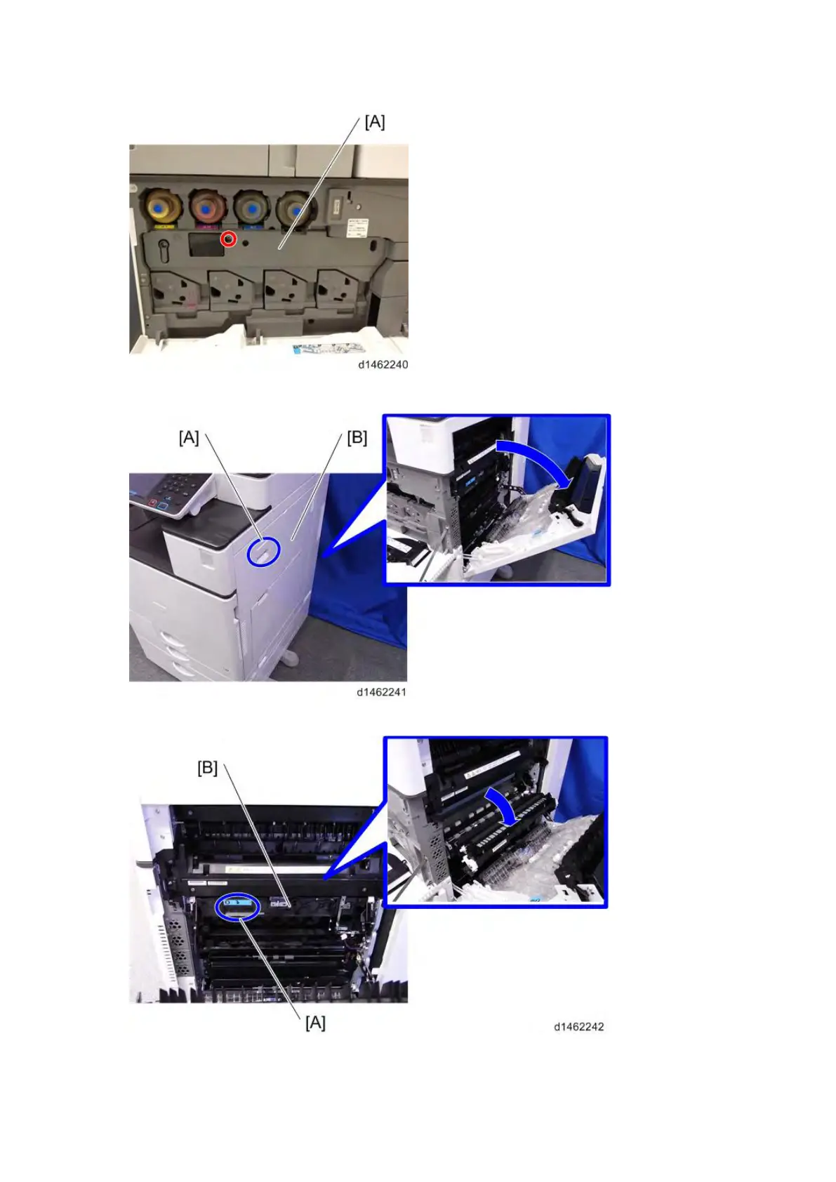 4. Pull the handle [A] and open the paper transfer unit [B].