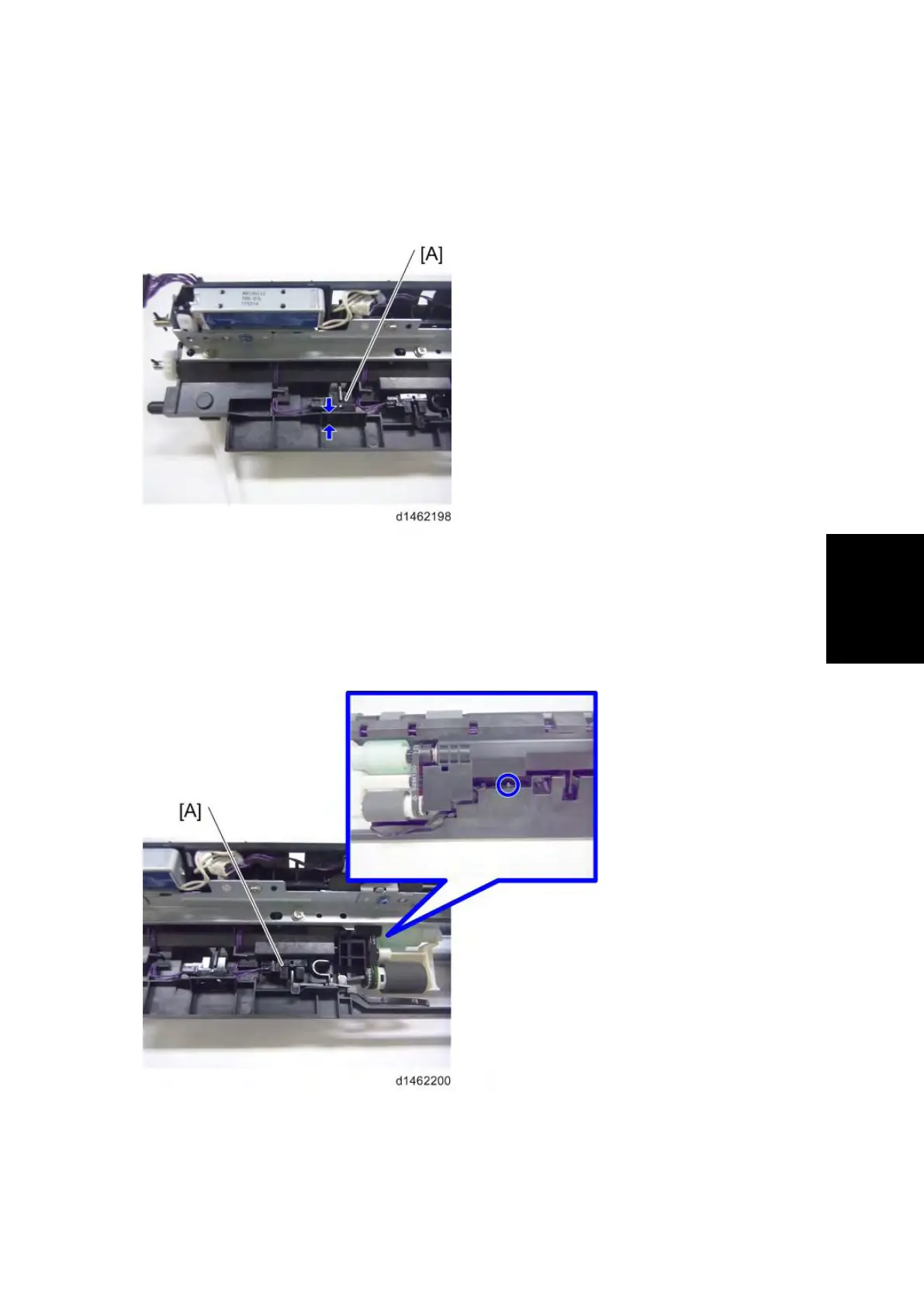 2. While pressing the tab enclosed by the blue circle, remove the paper end sensor [A]