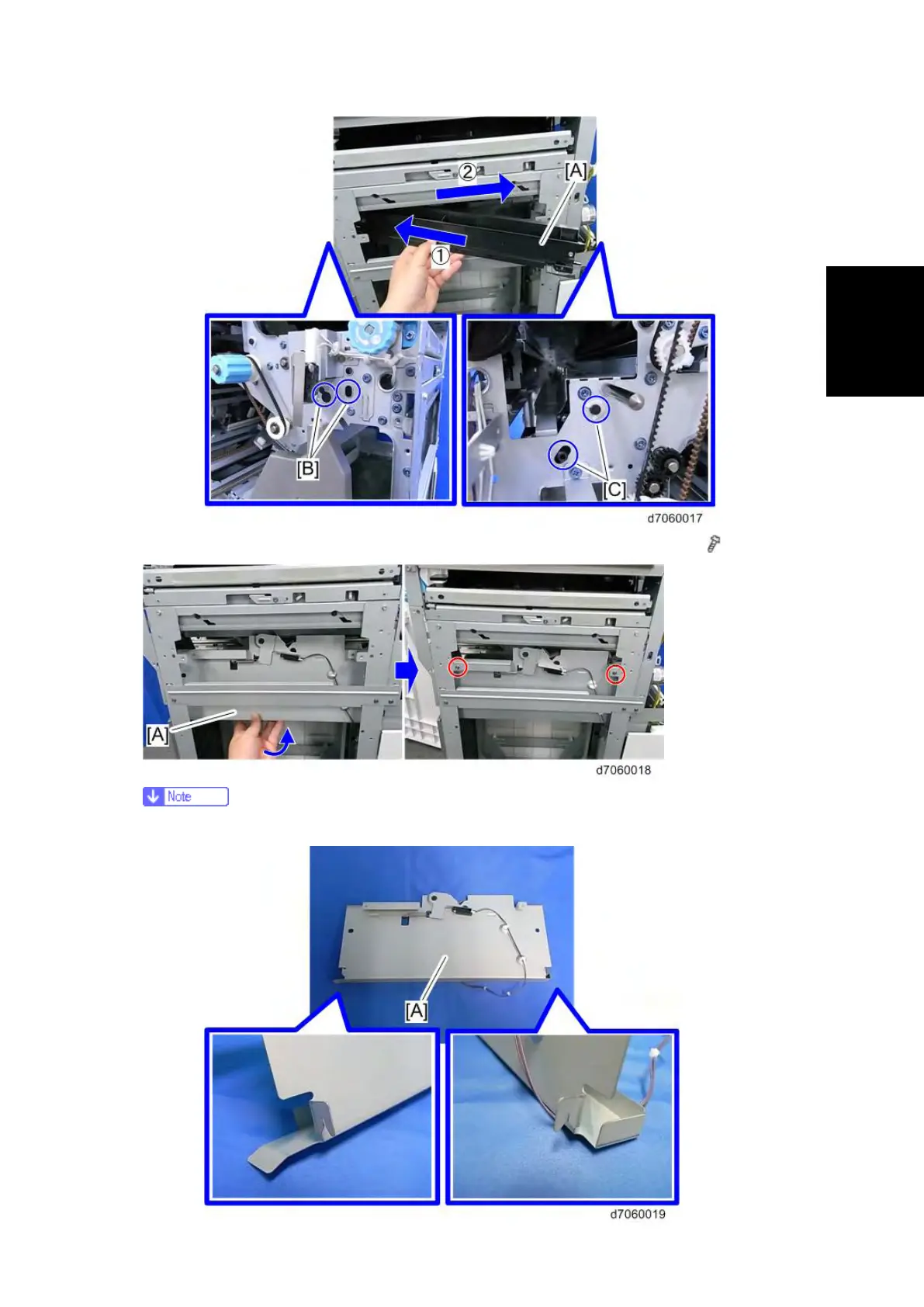 7. Attach the hopper bracket [A], inserting from the outside frame of the finisher. (