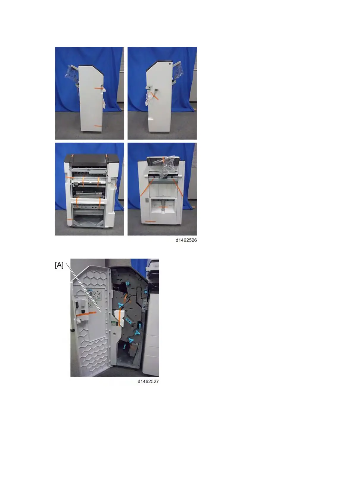 3. Pull out the saddle stitch unit [A] or stapling unit, and remove the filament tape and packing