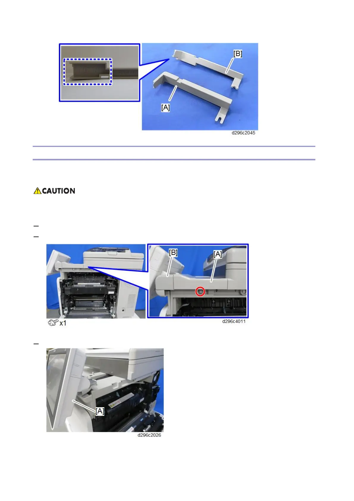 2. Remove the front right cover [A] and hinge cover [B].