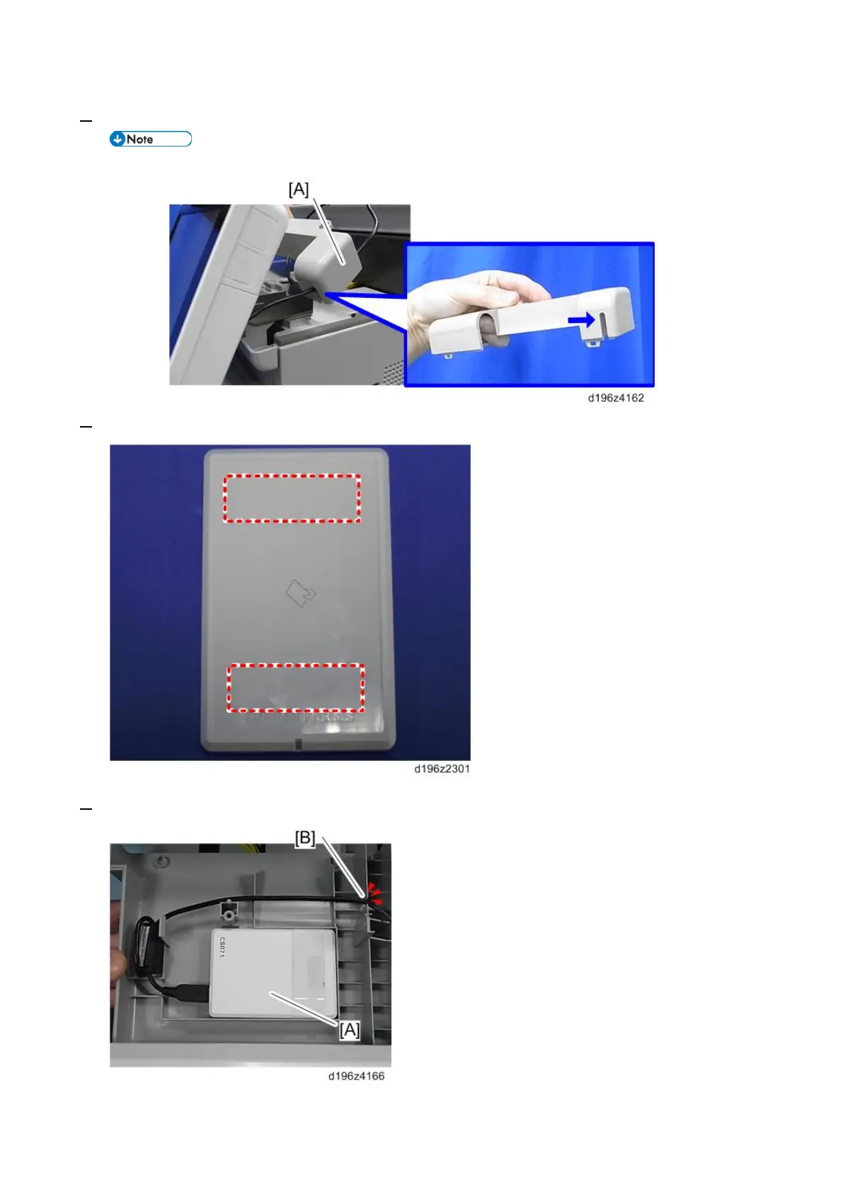 8. Attach the fasteners to the front side of the NFC reader [A].