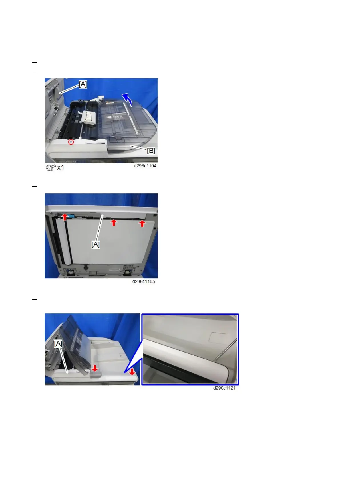 3. Open the ADF, then release the three tabs of the ADF front cover [A].