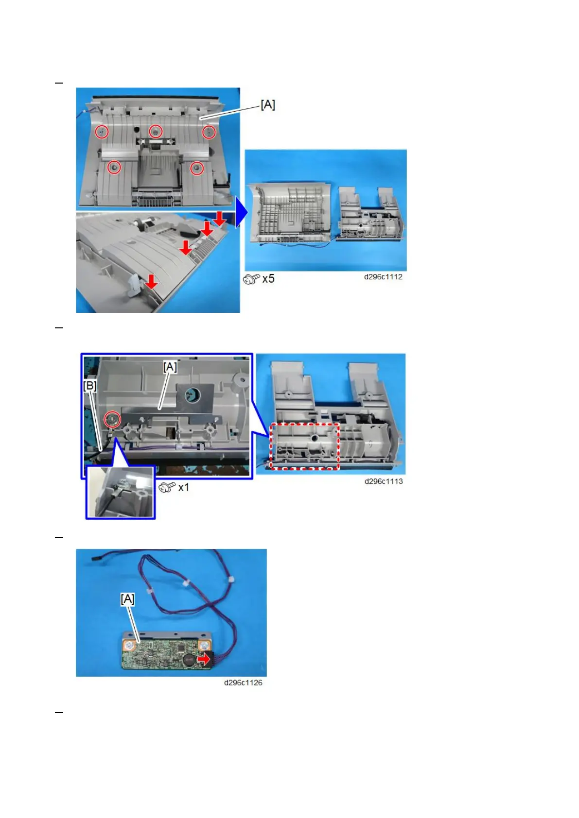 7. Attach the double-feed sensor (receiver) [A]. (Tapping screw: 3x10)