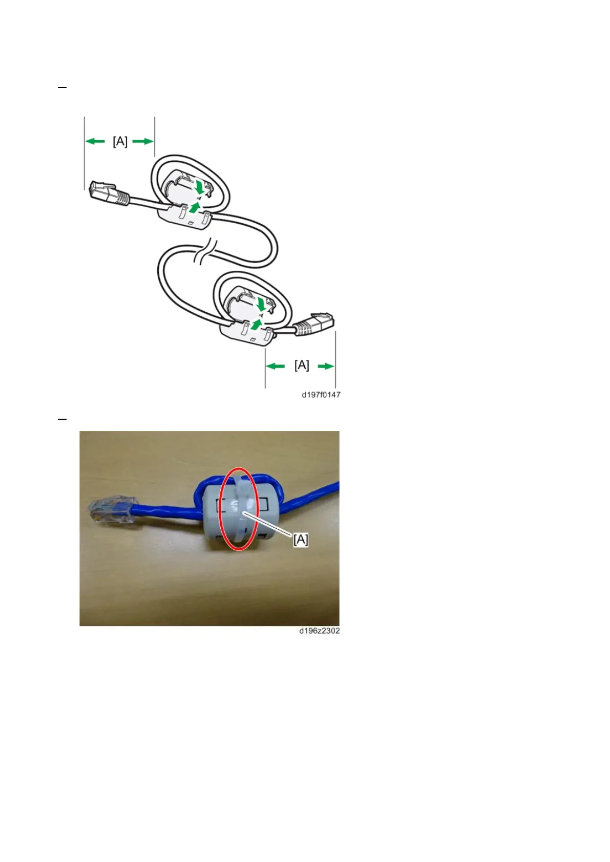8. Attach the ferrite cores to the Ethernet cable, while looping the cable at 3 cm (approx. 1.2 inch) [A] from
