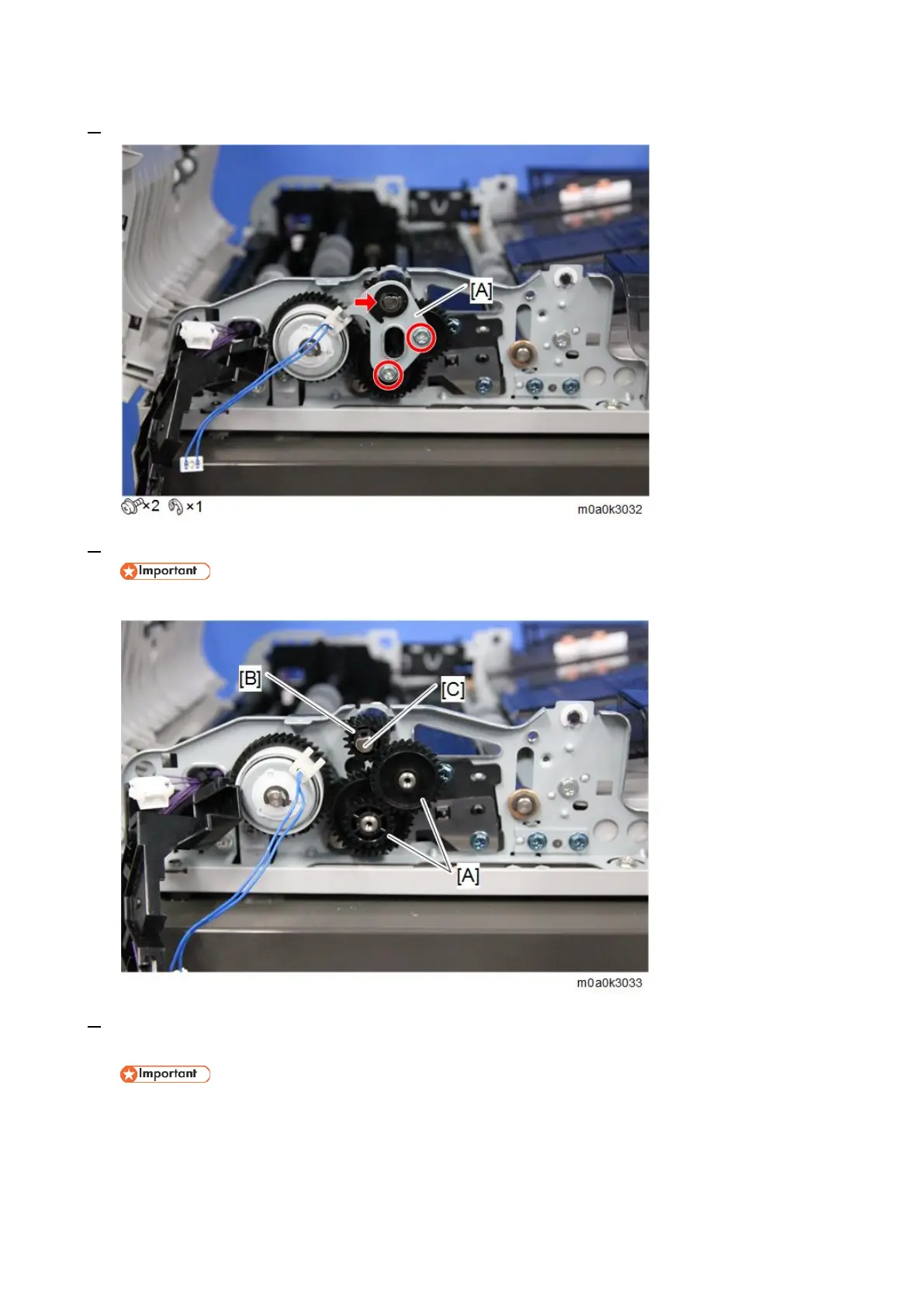 9. Open the ADF unit [A] while holding the gear [B] by hand, and open the scanning guide plate (rear side)