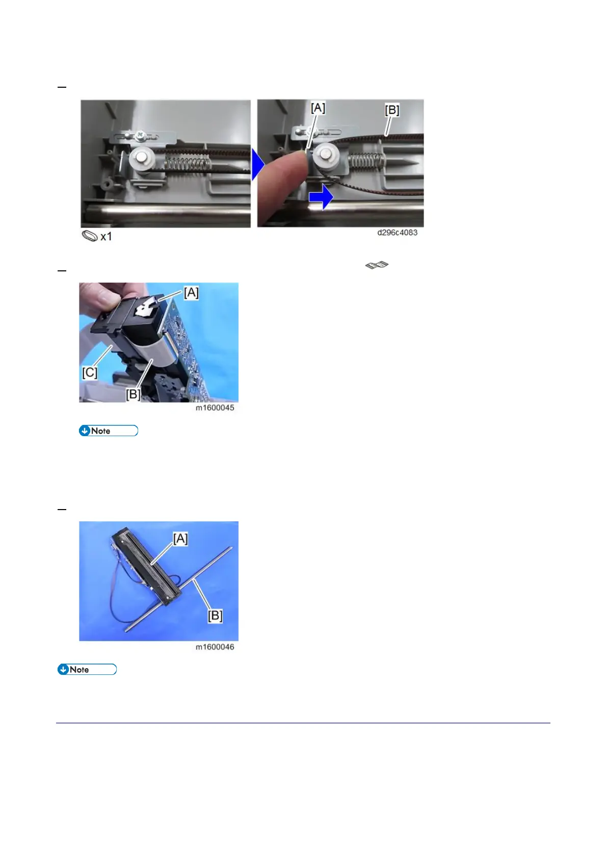 6. Slide the bracket [A] and then detach the carriage belt [B] from the pulley.