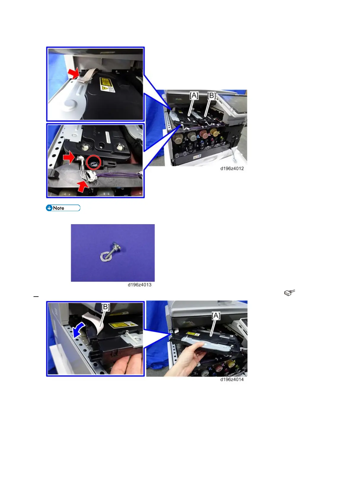 Pull the laser unit [A] out slightly, open the connector cover, and then disconnect the FFC [B]. ( × 1)