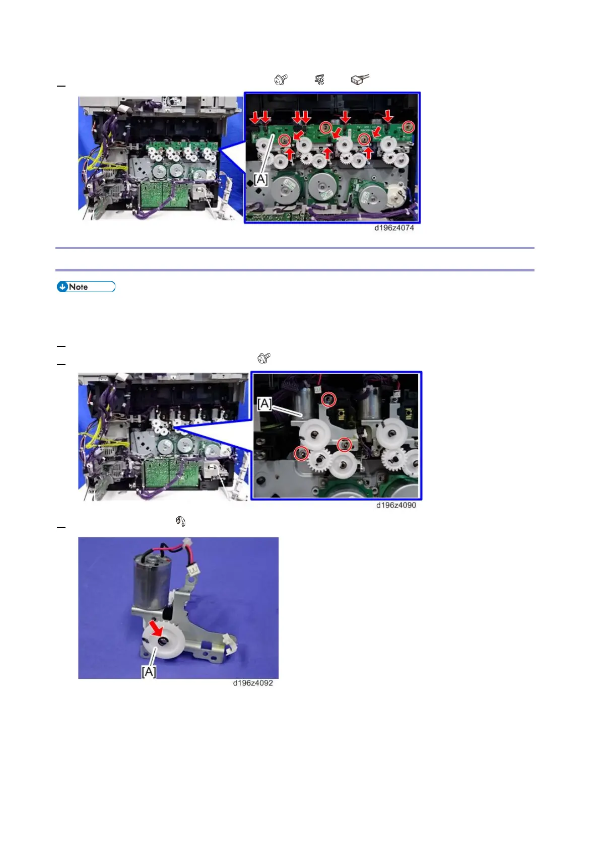 2. Remove the toner supply motor unit [A]. ( × 3 each)