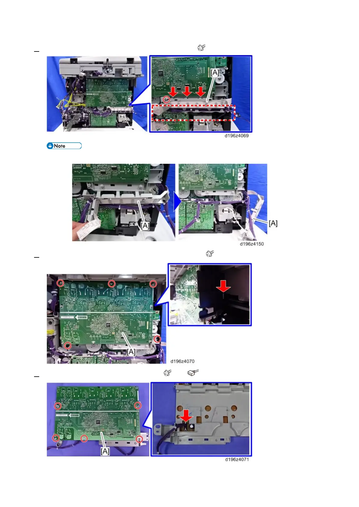 3. Remove the power pack (Development) [A] with the bracket. ( × 5, hook × 1)