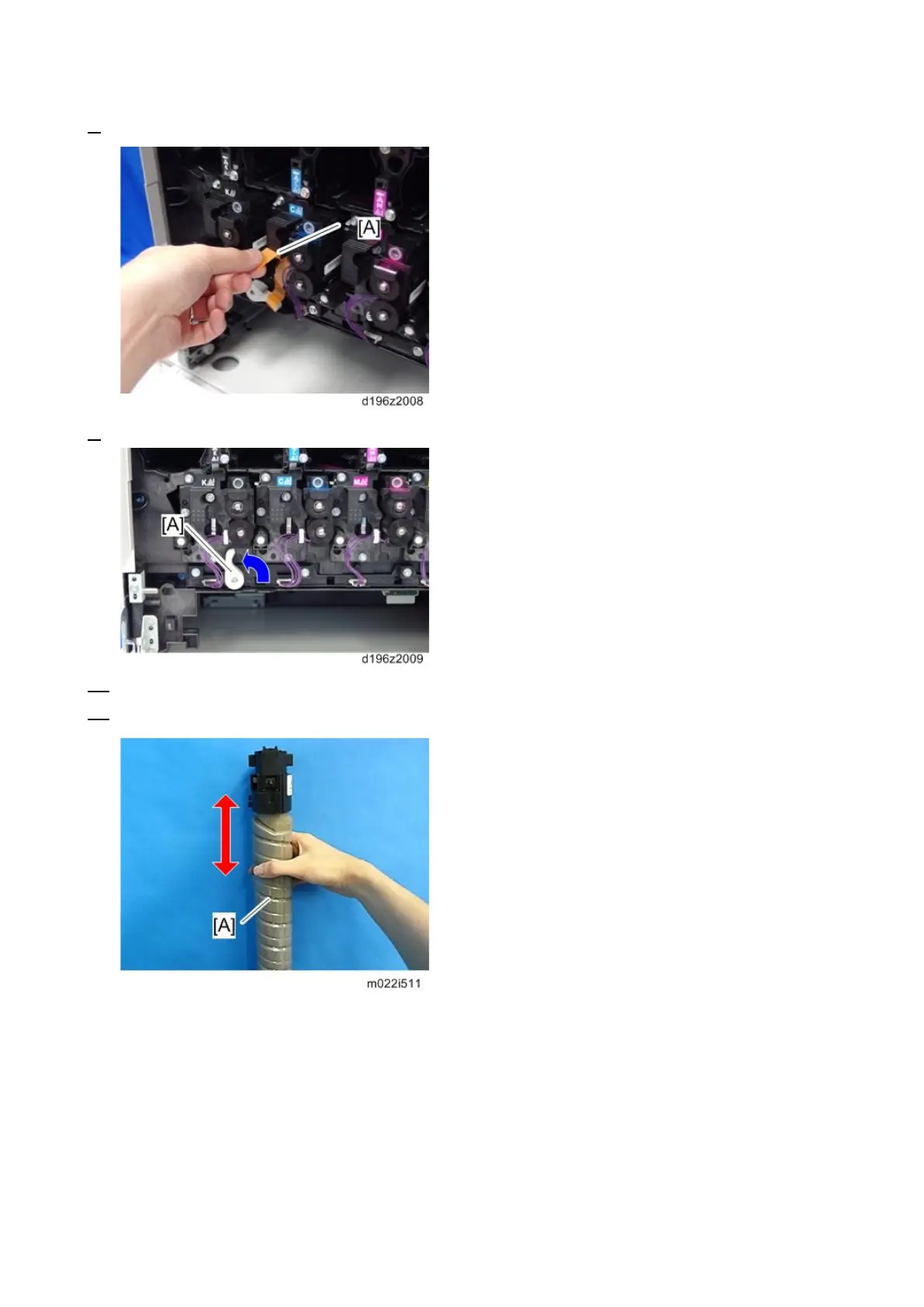 11. Shake each toner bottle [A] from eight to ten times.