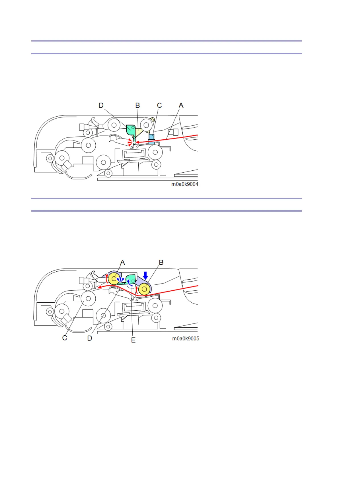 moves the feed sensor actuator [C] and the feed sensor [D] is turned ON. Then the feed roller clutch [E] is