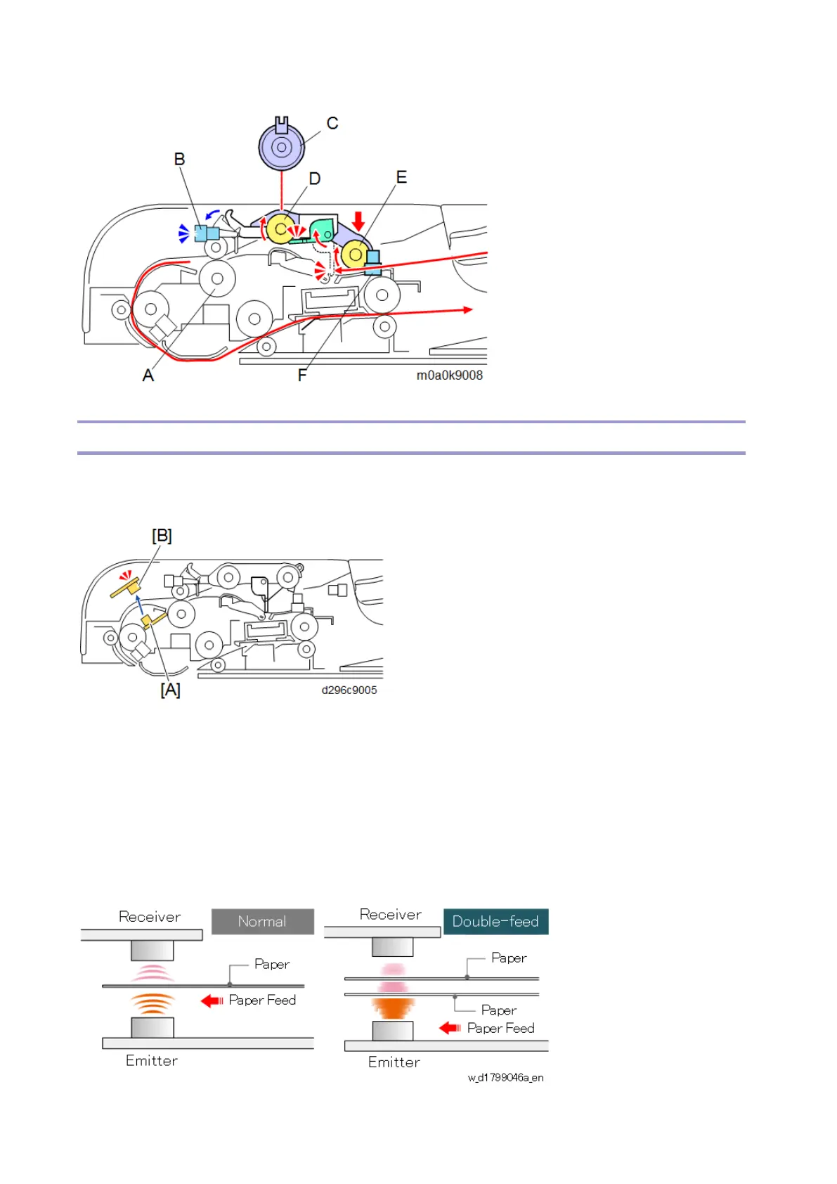 A pair of ultrasound sensors are mounted in the ADF, one below the original feed path (emitter [A]) and the