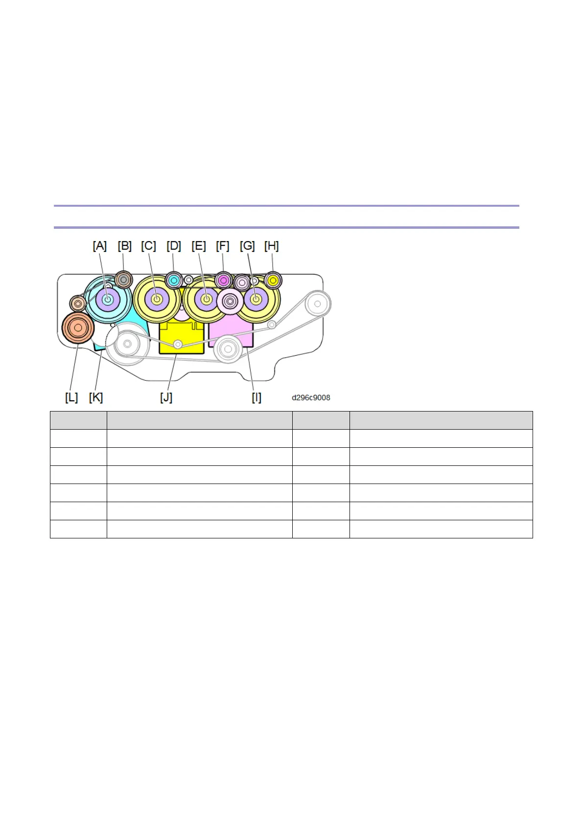 The Drum motor (Bk) [K] drives the drum (K). The Development Clutch [L] drives the Development Unit for