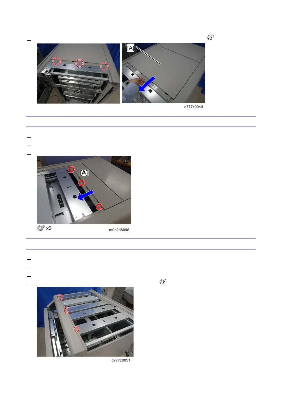 3. Remove the screws to slide the right top cover [A] in the direction of the arrow and remove it.