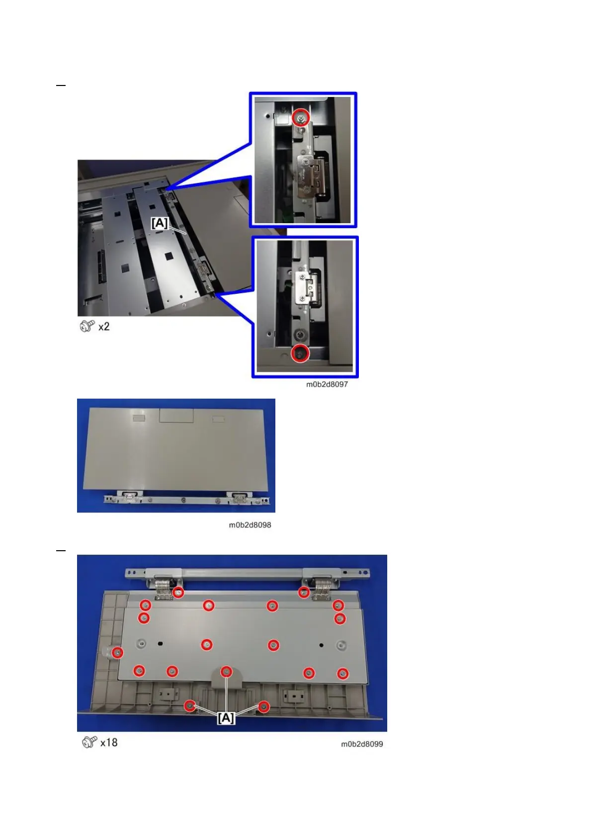2. Remove the screws on the stay [A], and then remove the stay with the top cover.