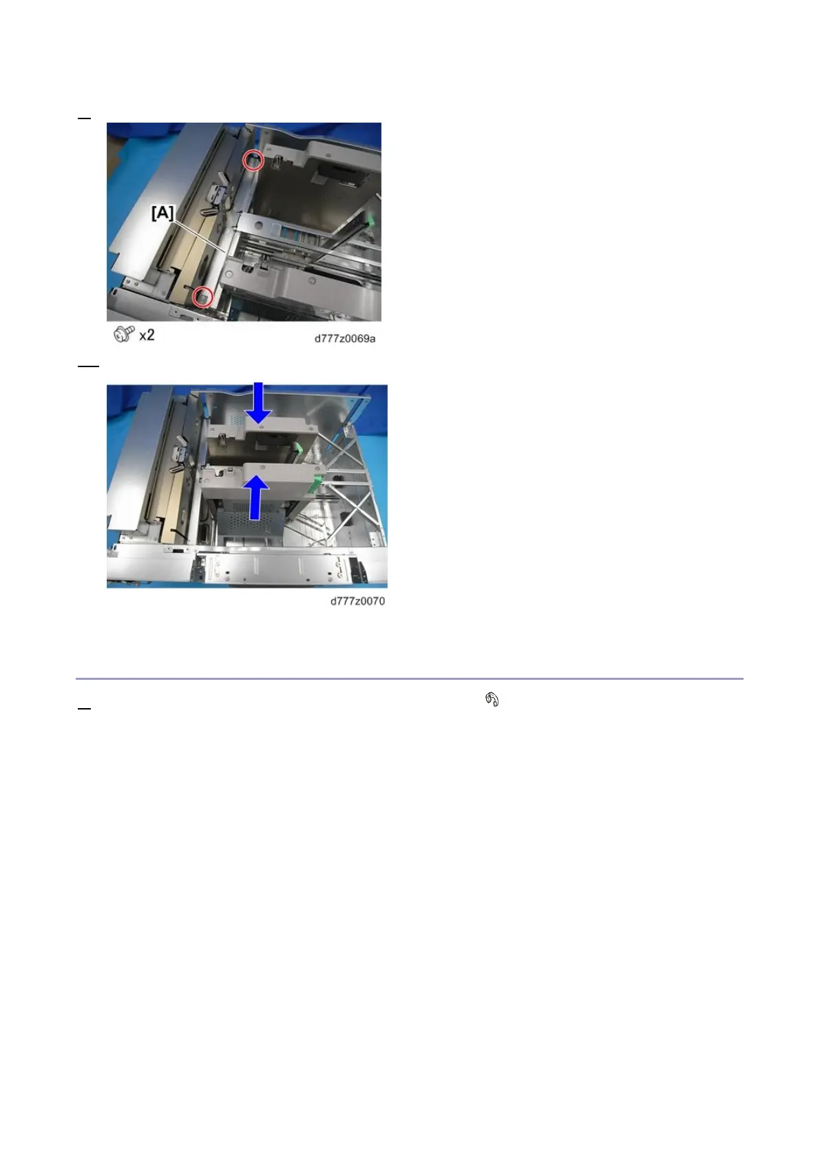 1. Remove the side fence shafts [A] and [B] on the front side ( x2). Pull out the shaft in the direction