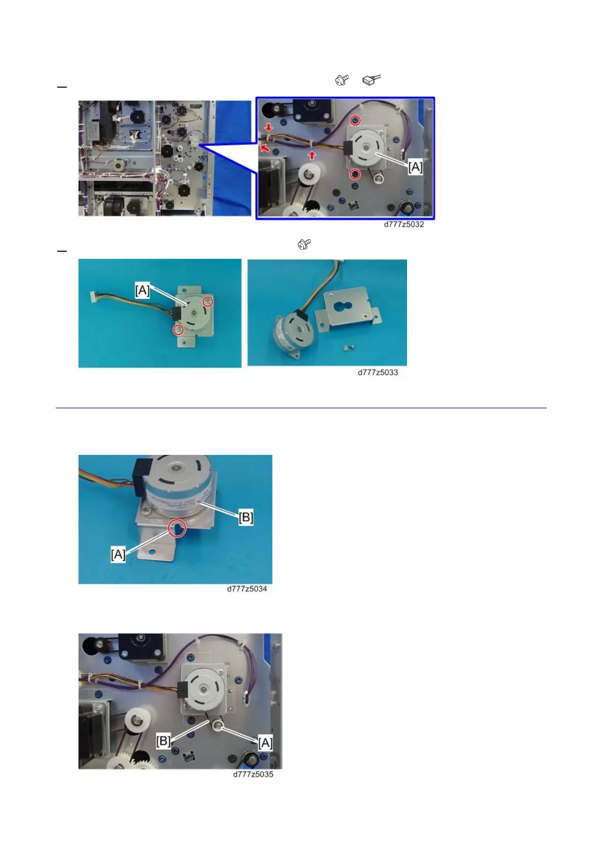 2. When attaching the motor bracket, turn the roller [A] to make sure that the timing belt [B] is