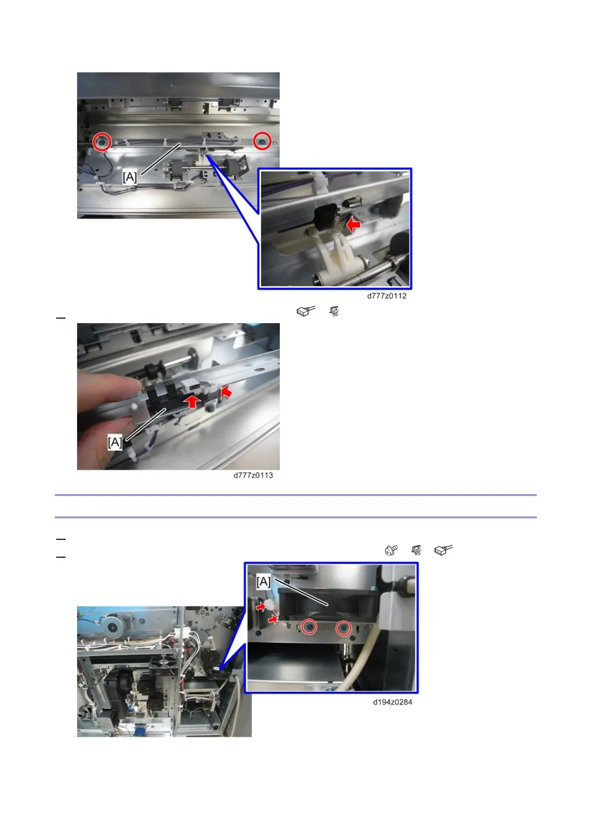 2. Remove the vertical transport unit cooling fan [A] with the bracket ( x2, x1, x1).