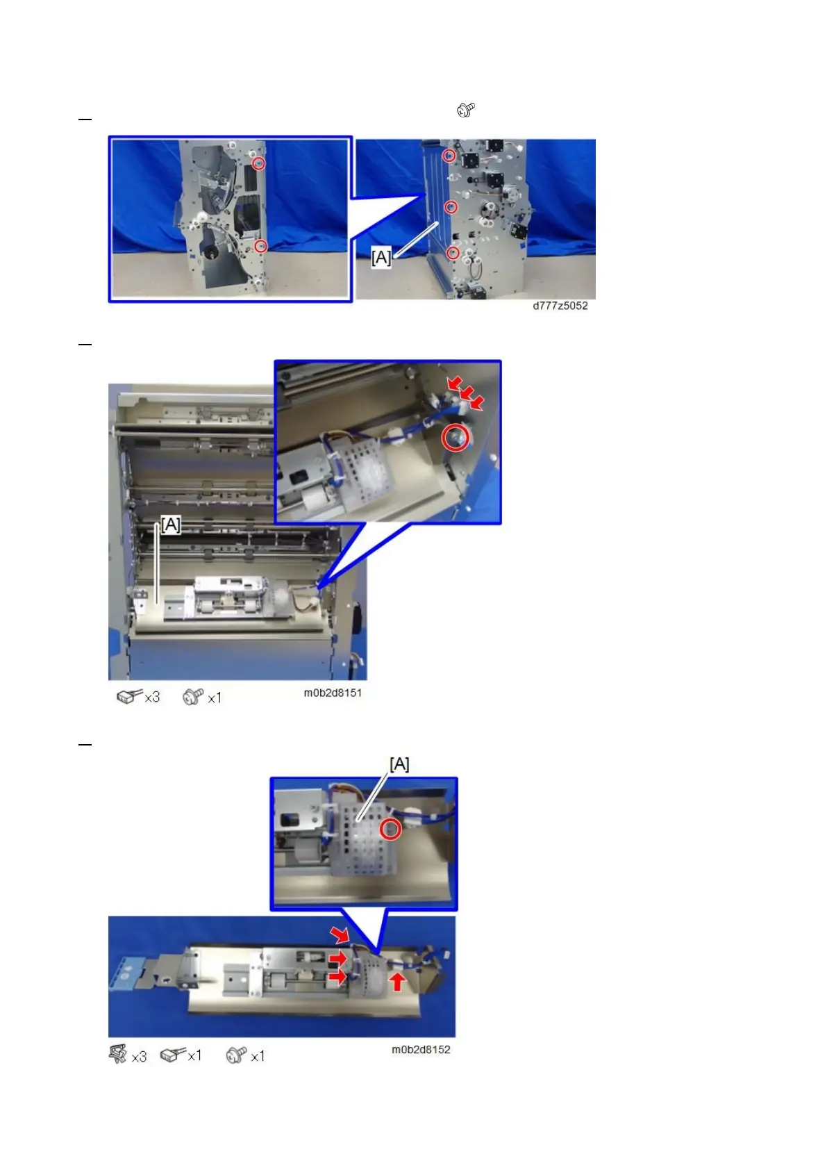 3. Remove the right cover [A] from the vertical feed unit ( x5).