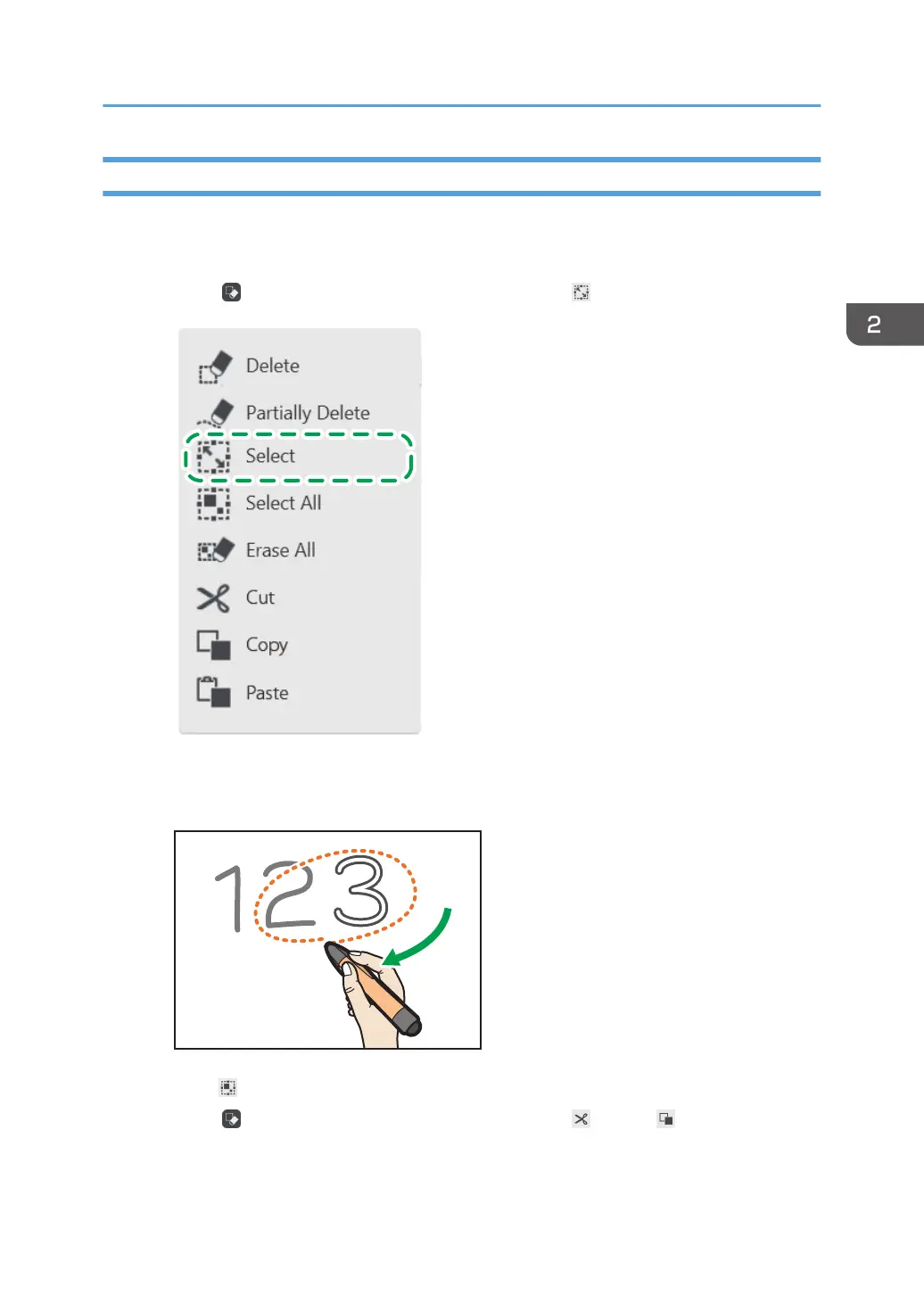 3. Touch , the Select and Delete icon, and then touch [Cut] or [Copy].