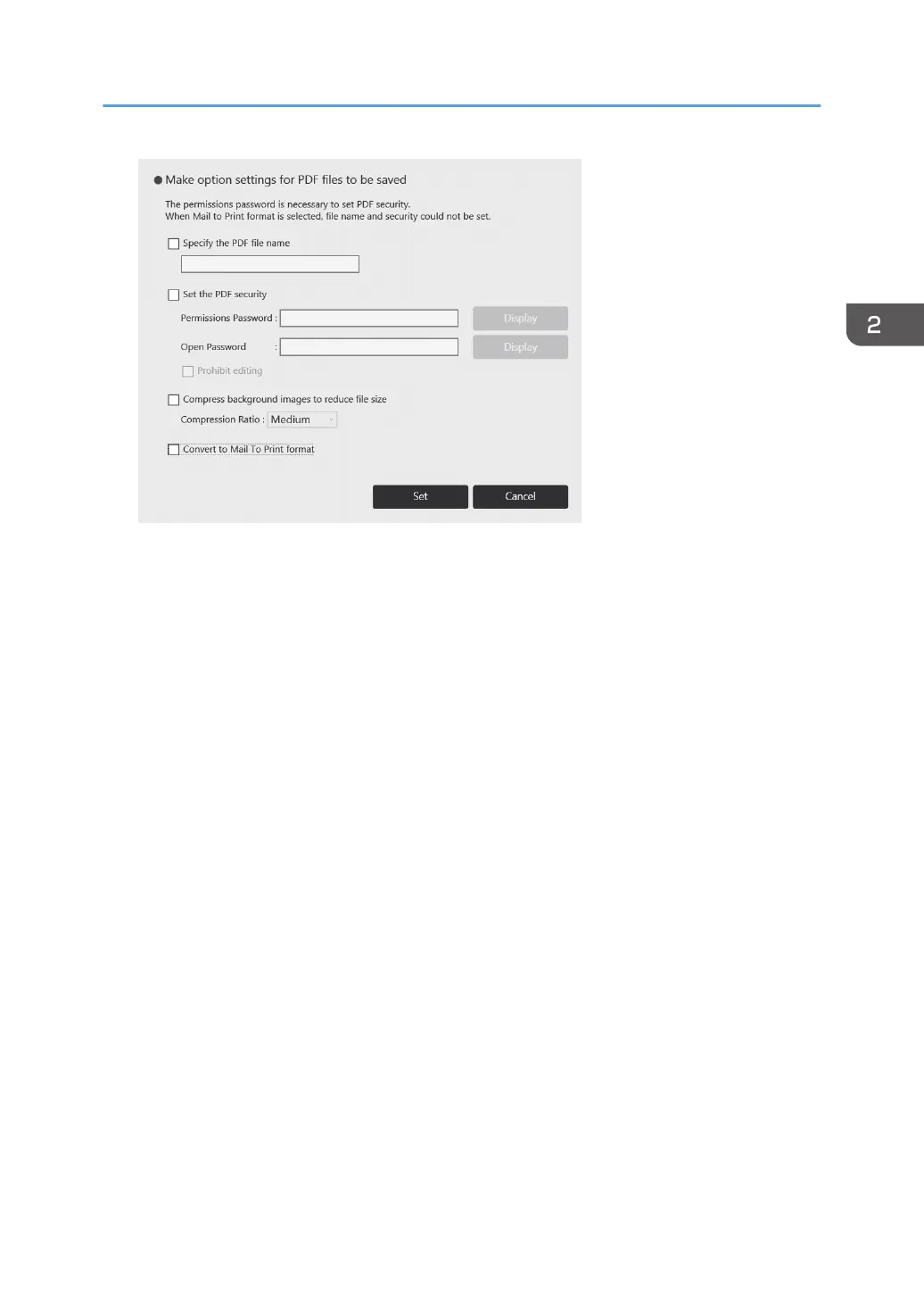 • To specify a password for a PDF file, select the [Set the PDF security] checkbox, and then
