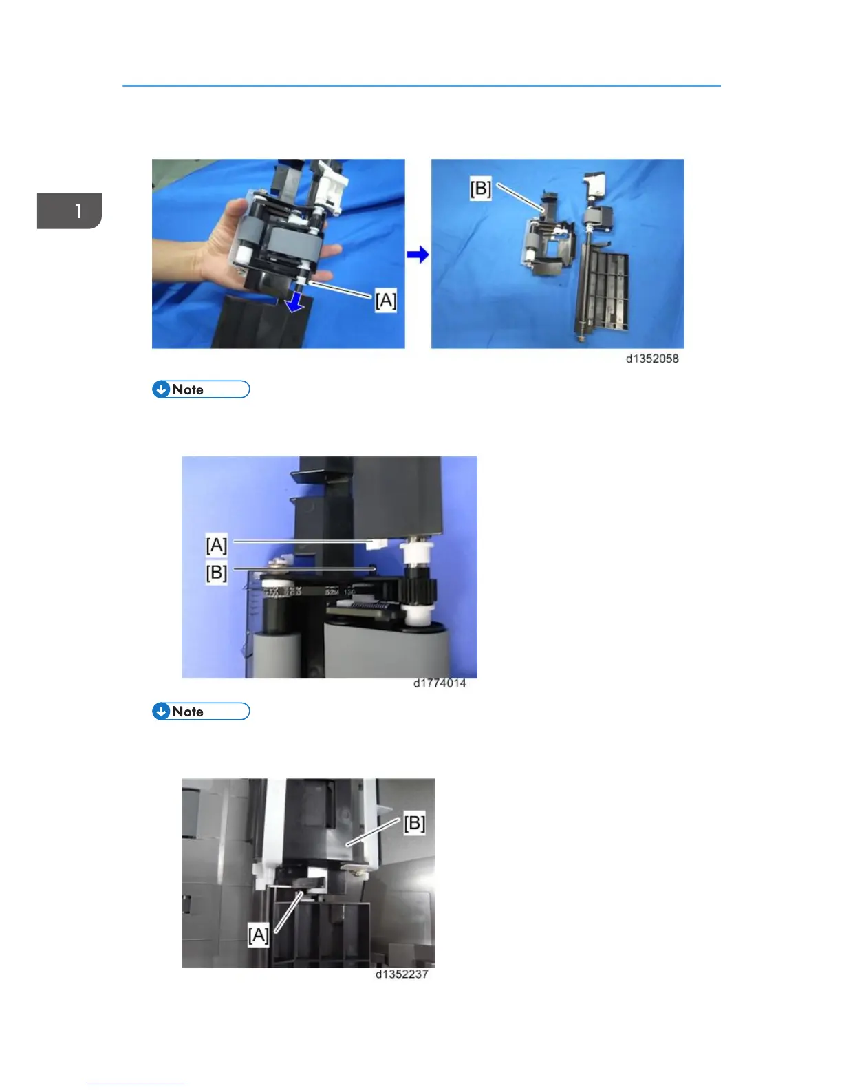 • When reassembling this unit, make sure that the boss [B] of the pick-up roller unit is in the hole