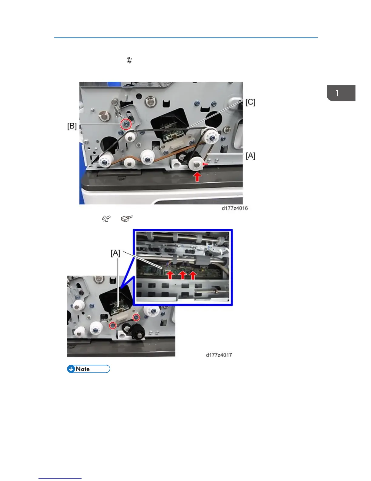 7. Loosen the screw [B], and then remove the long timing belt [C].
