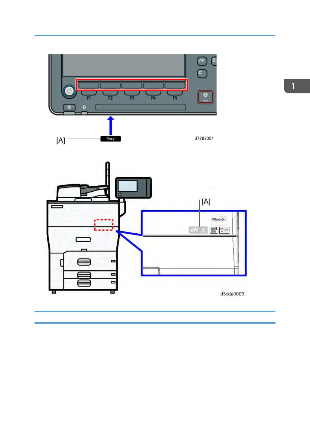 9. Attach the Fiery Decal [A] to the copier front cover.