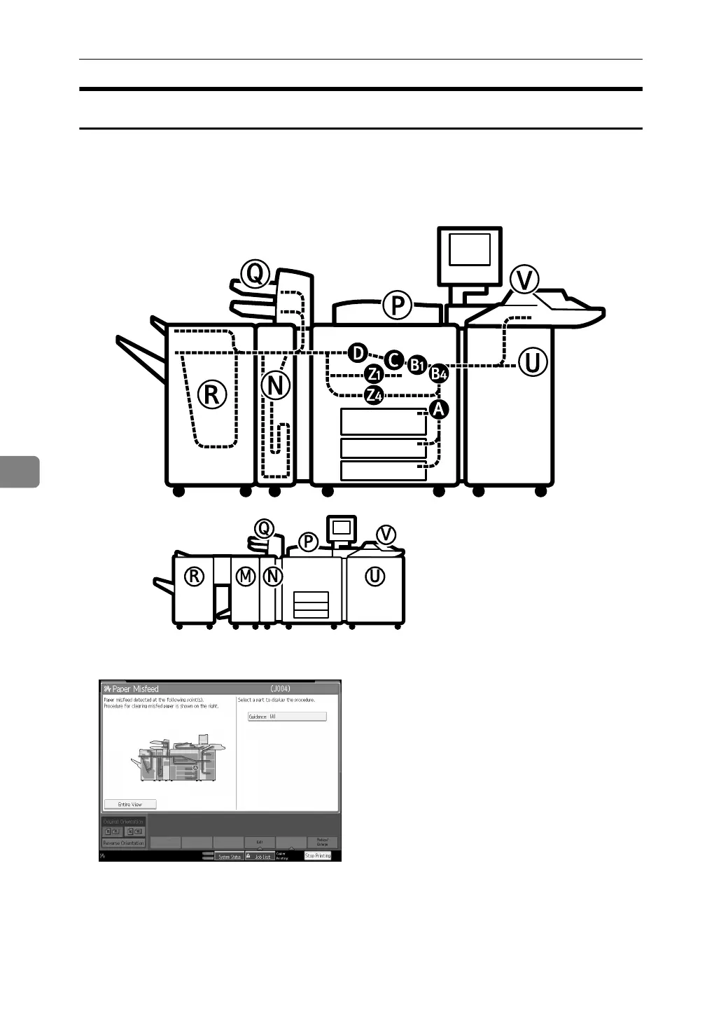 A misfeed has occurred in the place corresponding to the letter displayed on the
