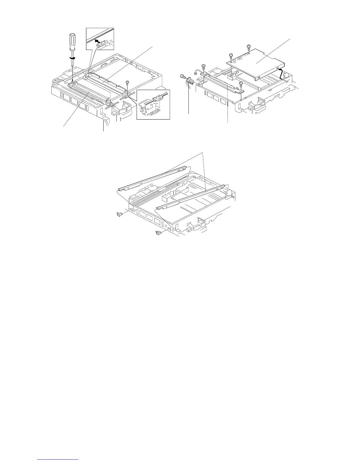 10. Remove both scanner guide rails [F] (1 spring plate each).