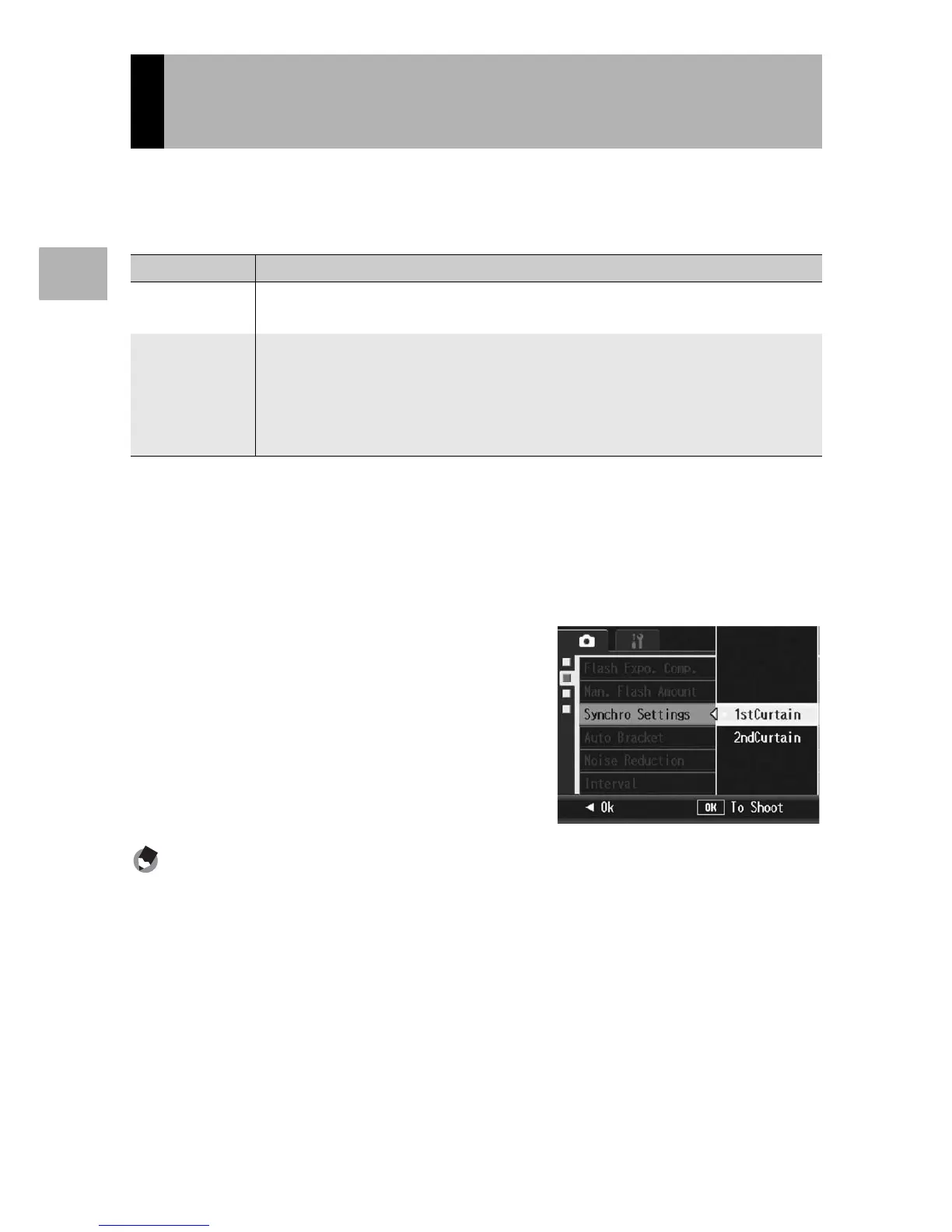 1stCurtain The flash fires right after the exposure starts. Select this setting for normal