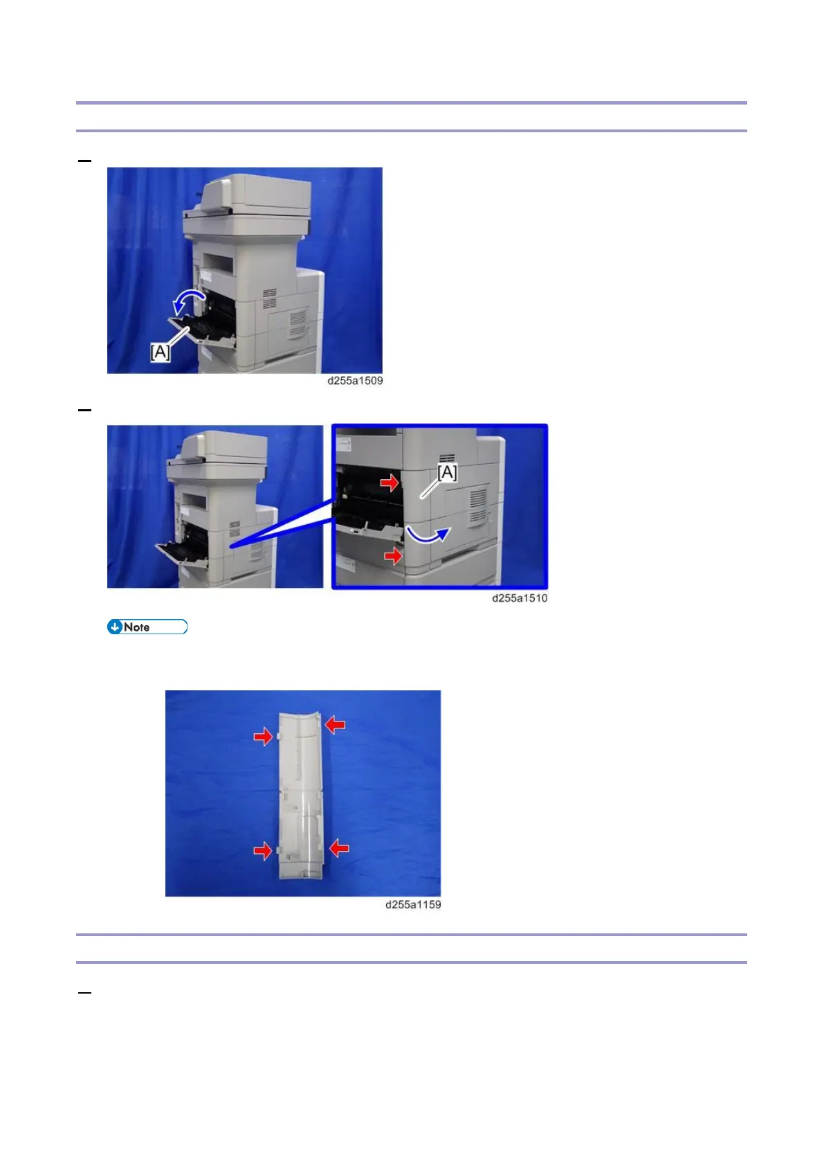 2. Remove the left rear cover [A] by rotating it in the direction of the arrow. (hook×2)