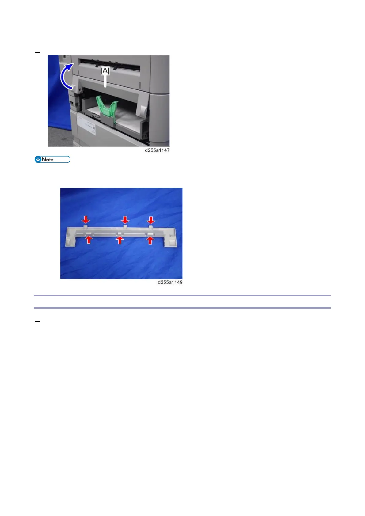 1. Release the right hinge [A] of the rear lower cover [B] by pushing the rear lower cover inward with a