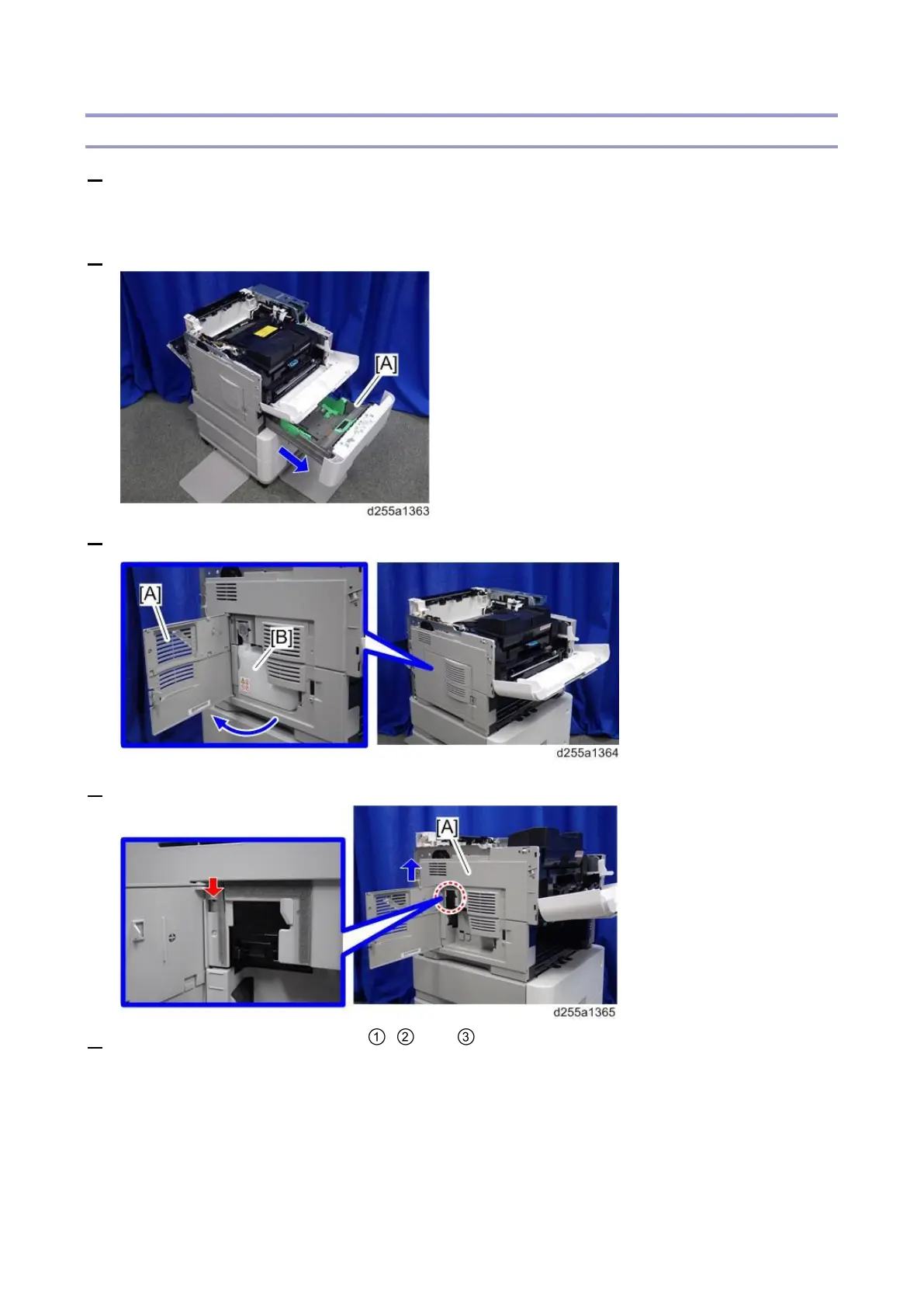 3. Open the waste toner bottle cover [A], and then remove the waste toner bottle [B].