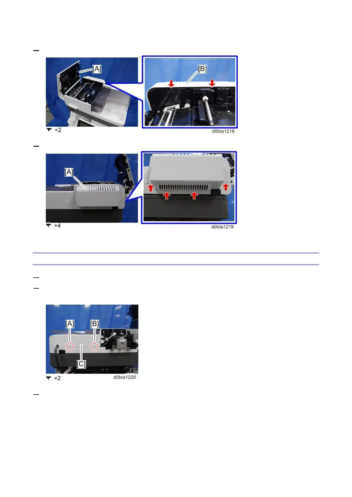 3. Push the DF rear right cover [A] towards the machine rear side to release three hooks, and then