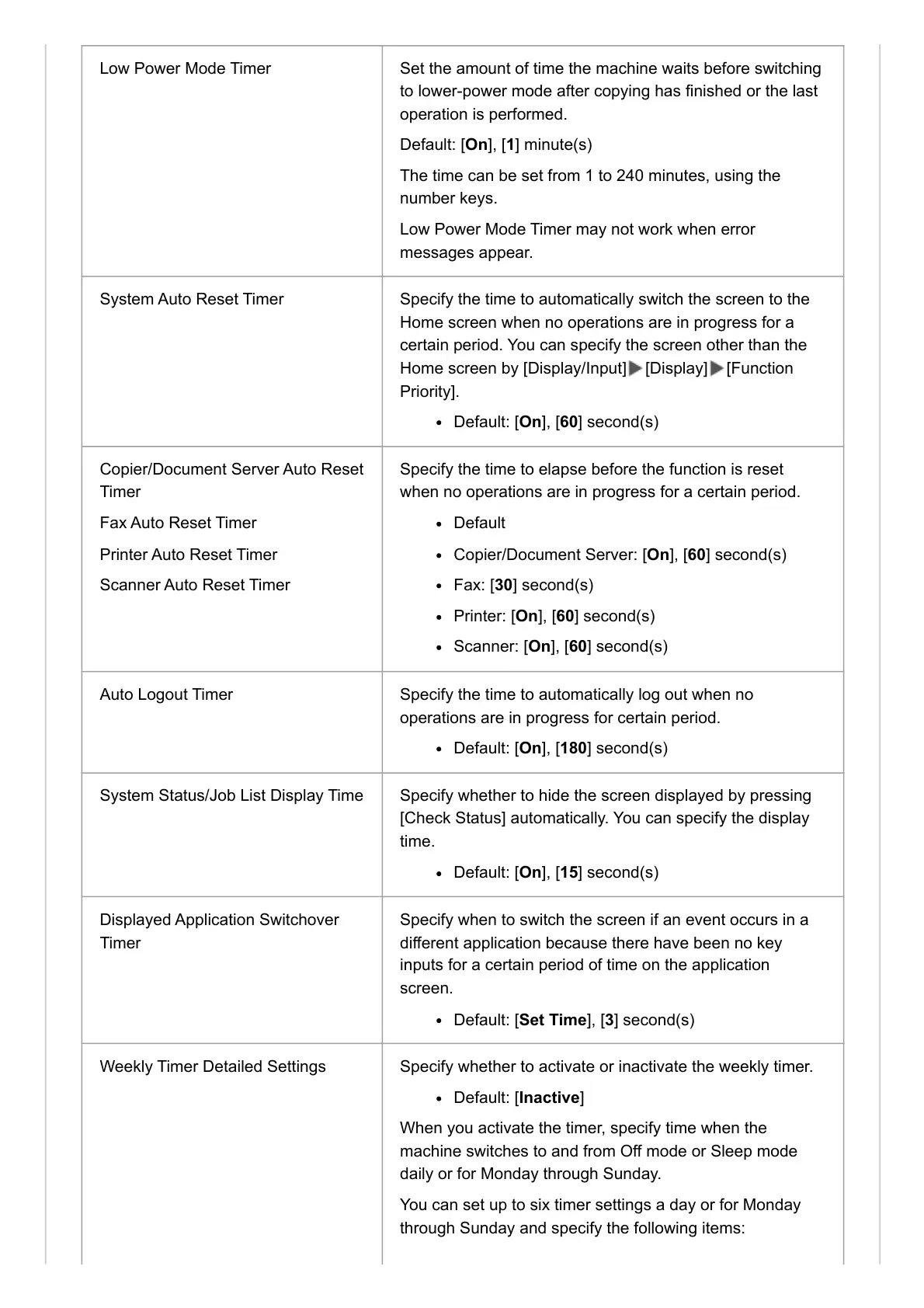System Status/Job List Display Time Specify whether to hide the screen displayed by pressing