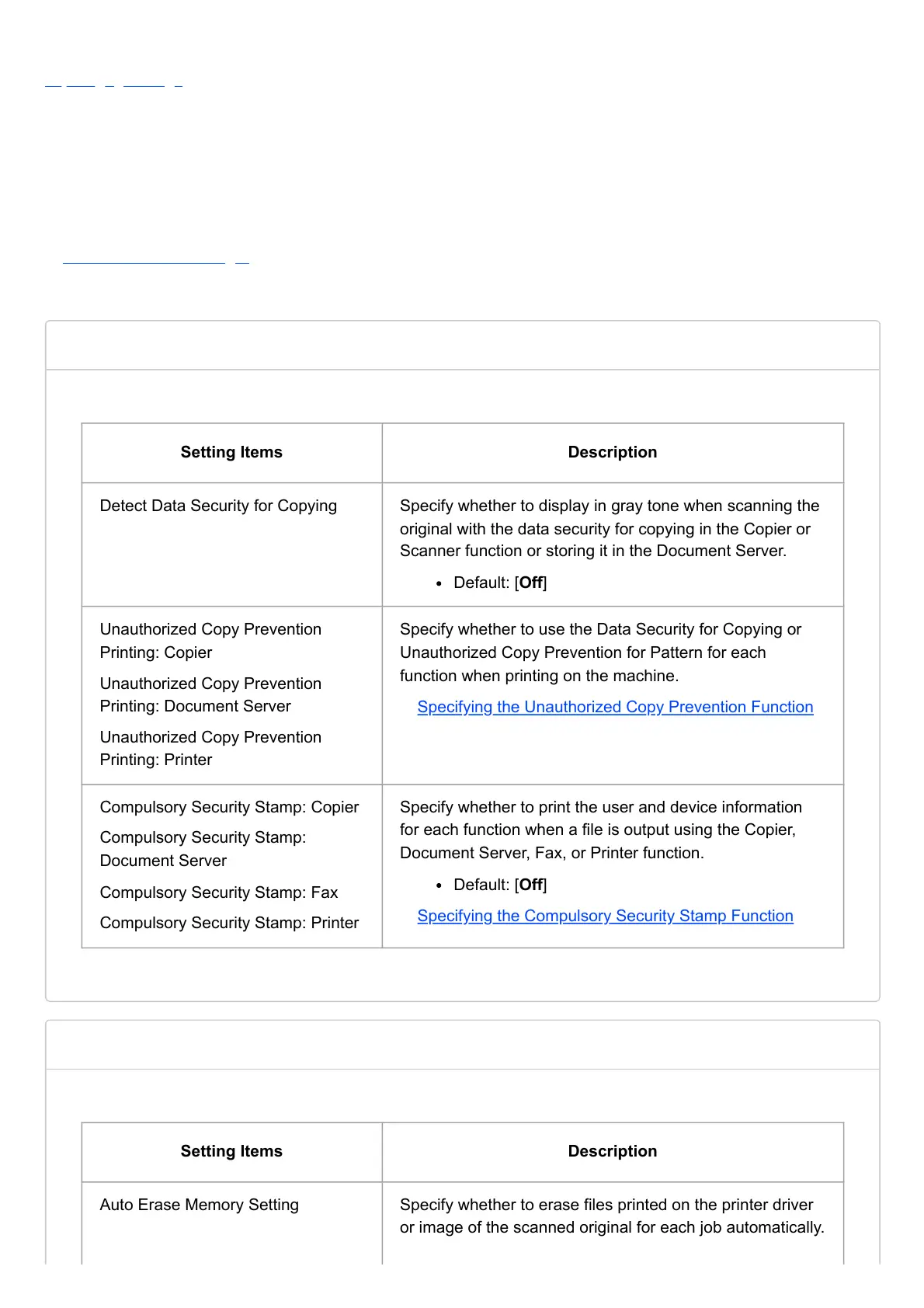 Auto Erase Memory Setting Specify whether to erase files printed on the printer driver