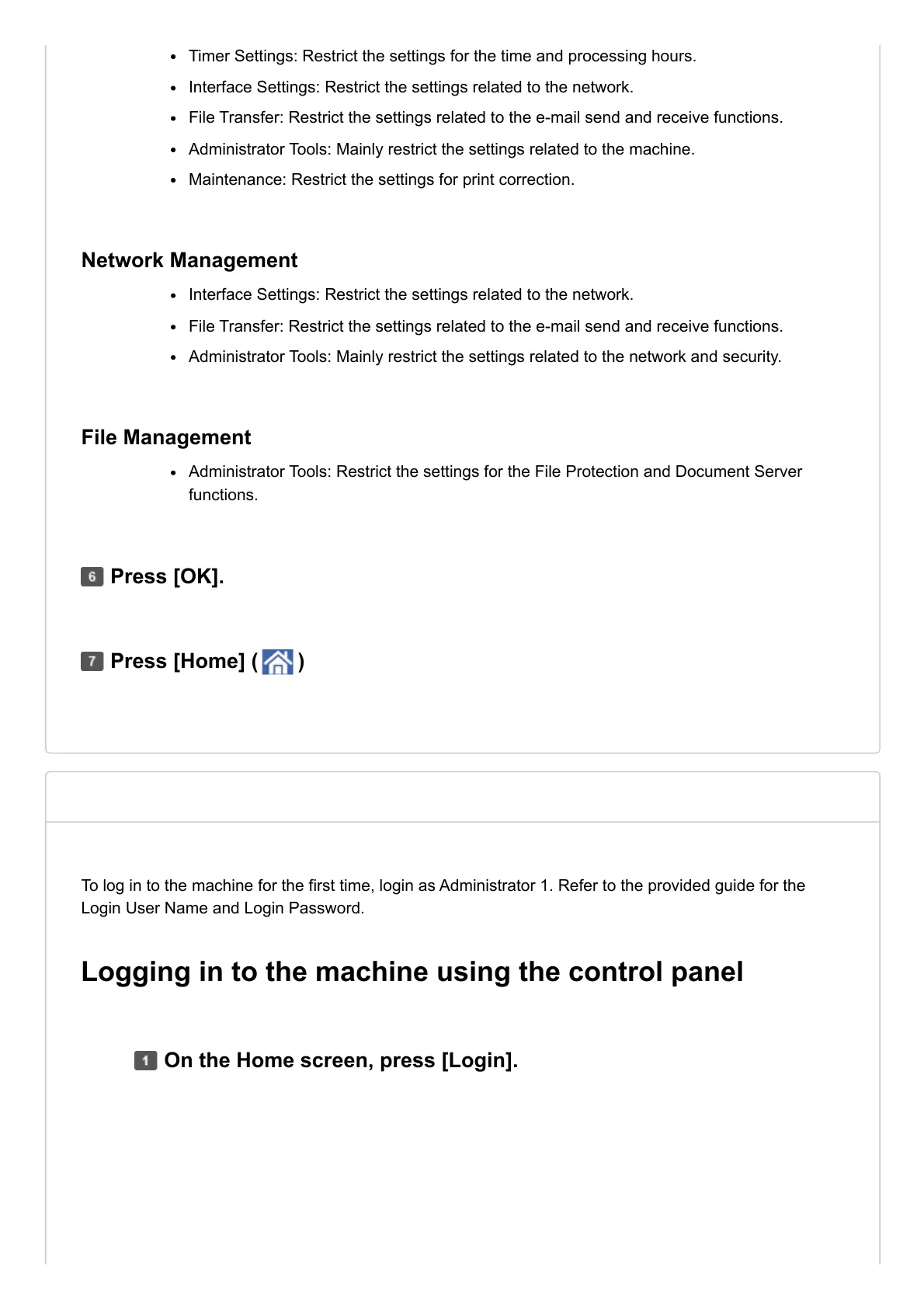 To log in to the machine for the first time, login as Administrator 1. Refer to the provided guide for the