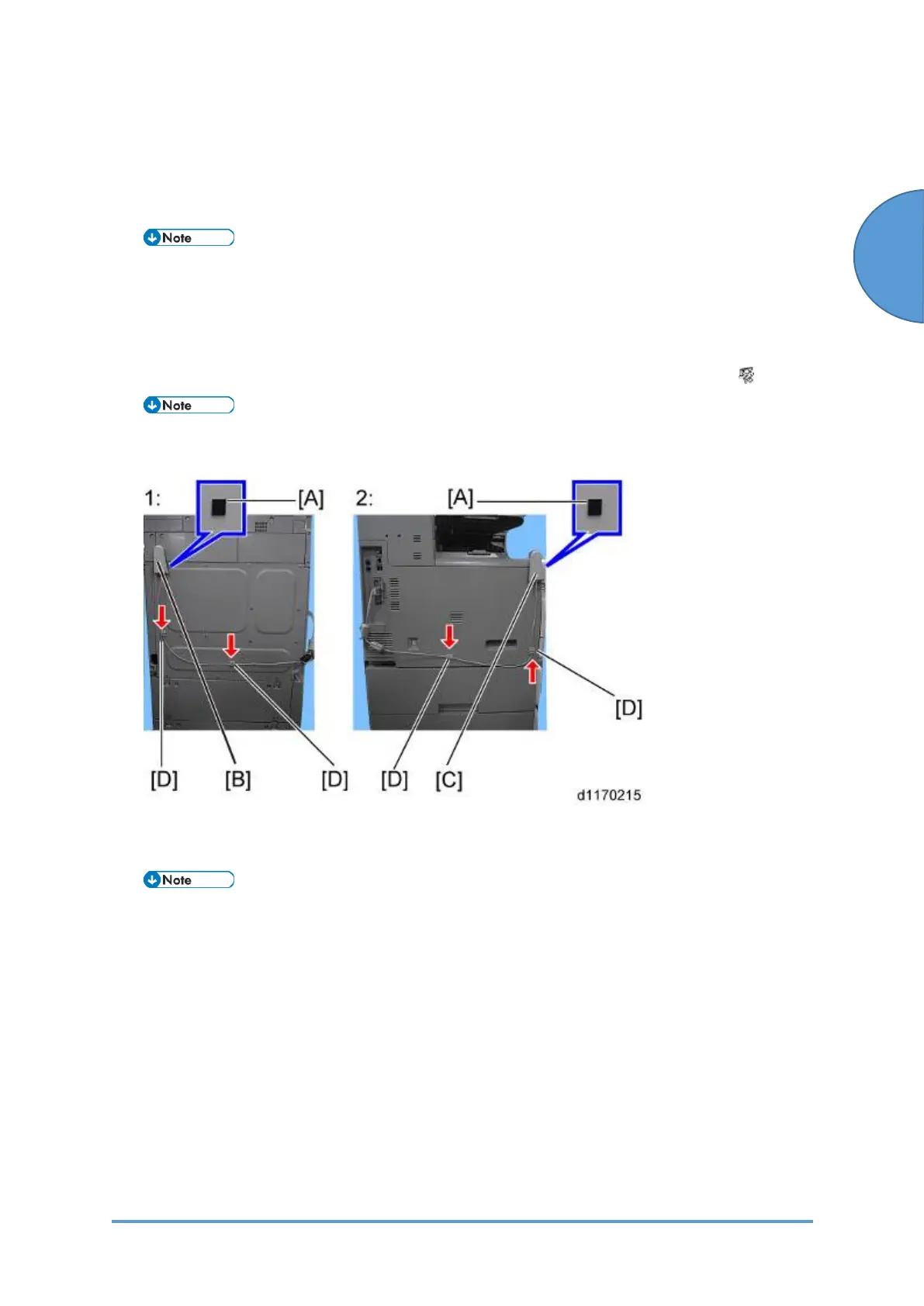 3. Attach the clamps [D] as shown below, and then wire the cables and clamp them. ( × 4)