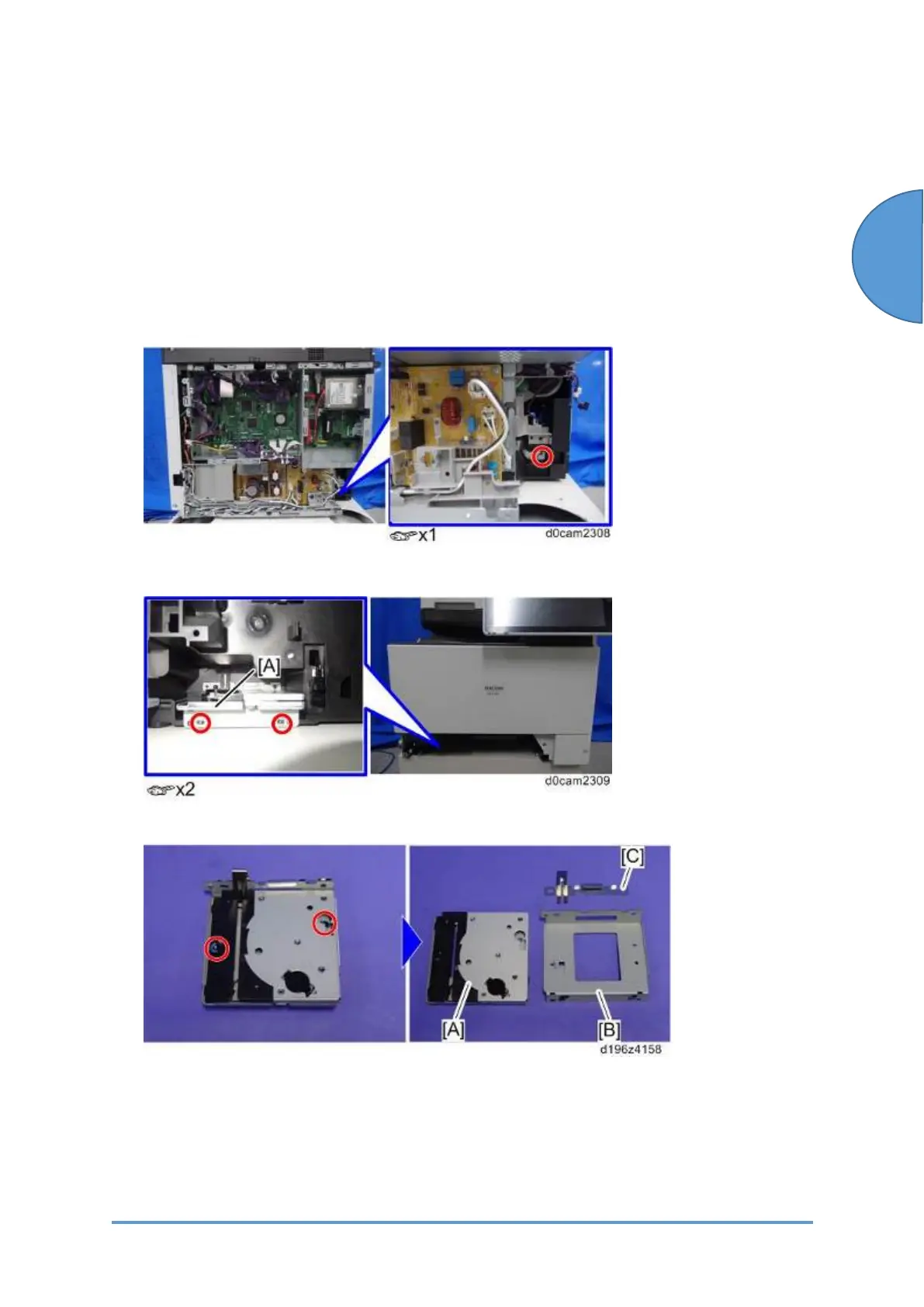 4. Remove the bracket [B] and grounding plate [C] from the draw-in unit [A].