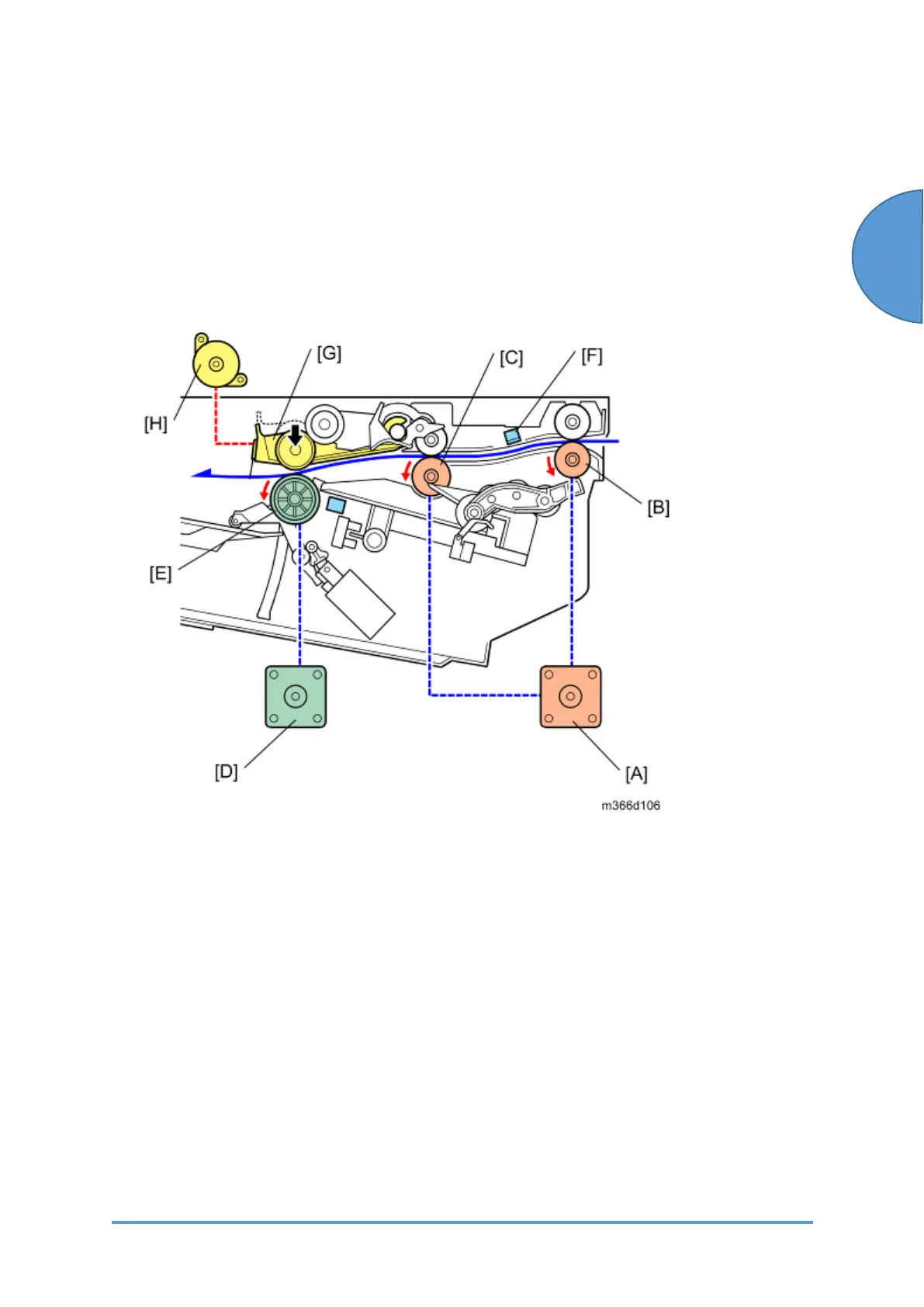 Paper transport motor (M16) [A] drives the entrance roller [B] and shift roller [C].