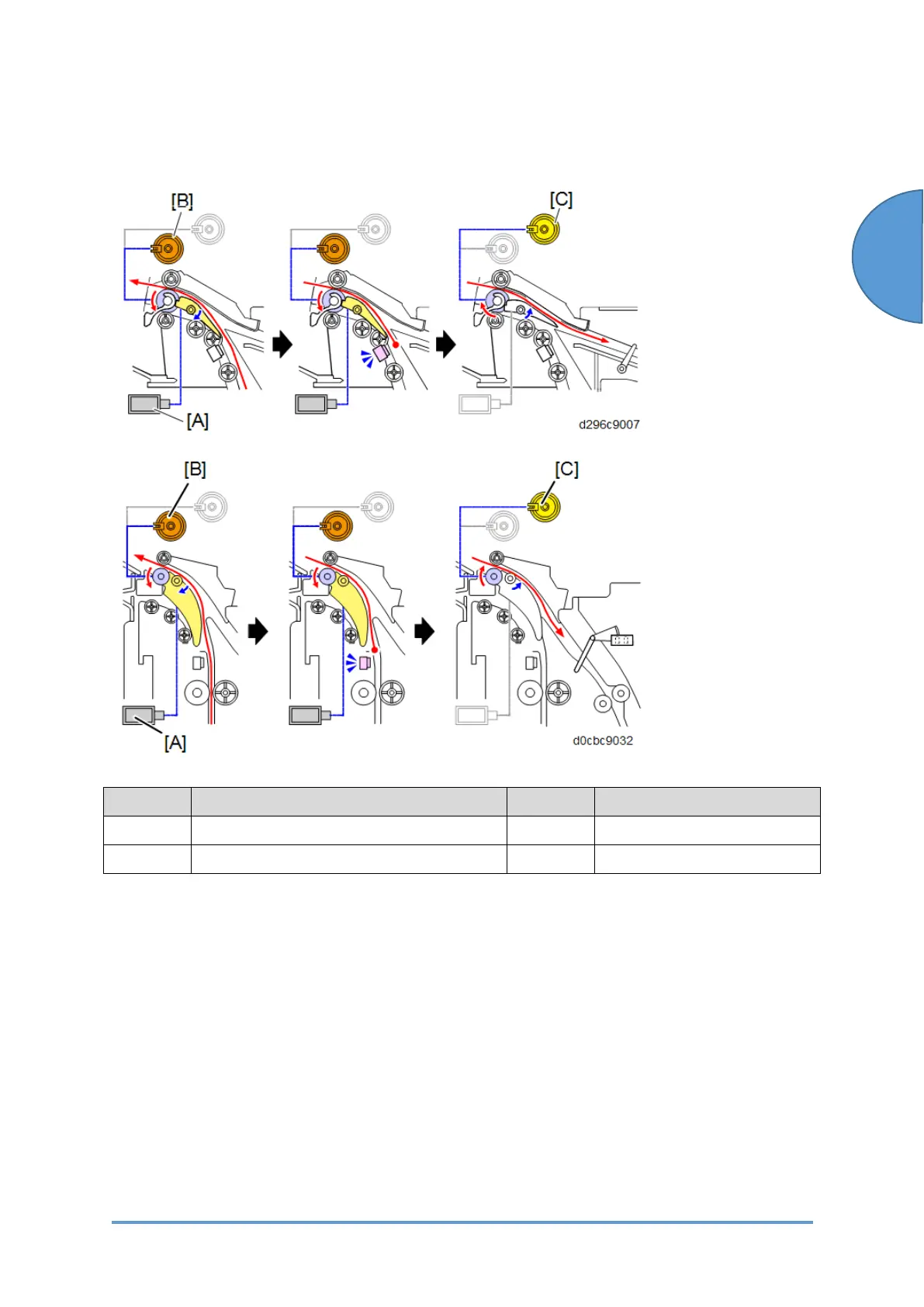 The junction gate solenoid (SOL1) [A], paper exit clutch (CL3)[B], and reverse clutch (CL2)[C]