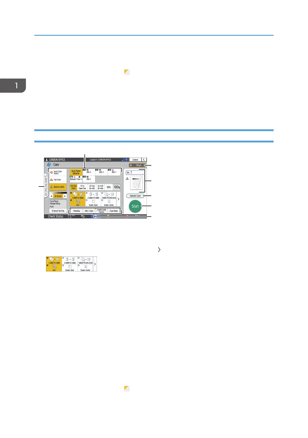 Displays an image representing the quantity and the settings configured on the Copy screen. Press [Quantity]